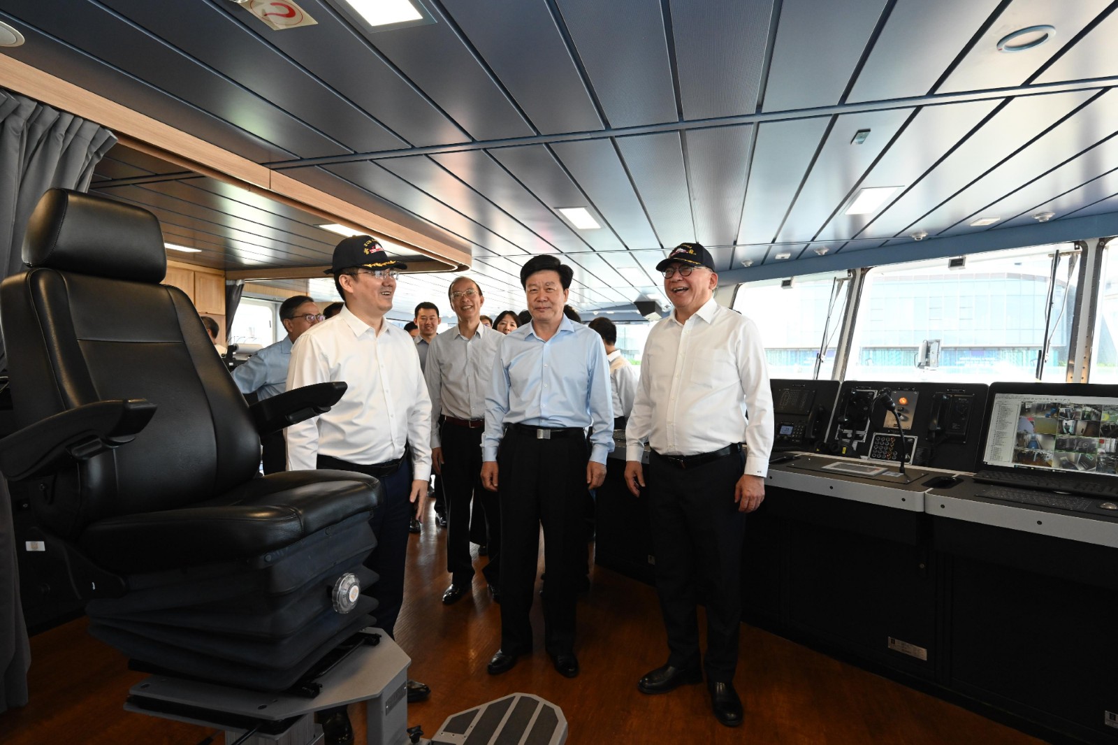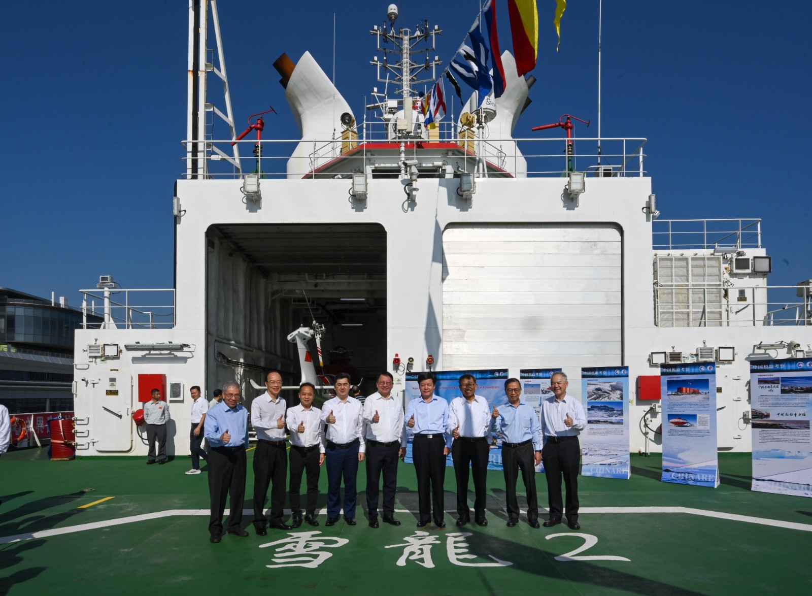 (左三起)中聯(lián)辦教育科技部副部長葉水球、廣州市市長孫志洋、陳國基、自然資源部副部長孫書賢、香港中文大學(xué)校長段崇智教授,以及其他嘉賓參觀「雪龍2」號。政府新聞處