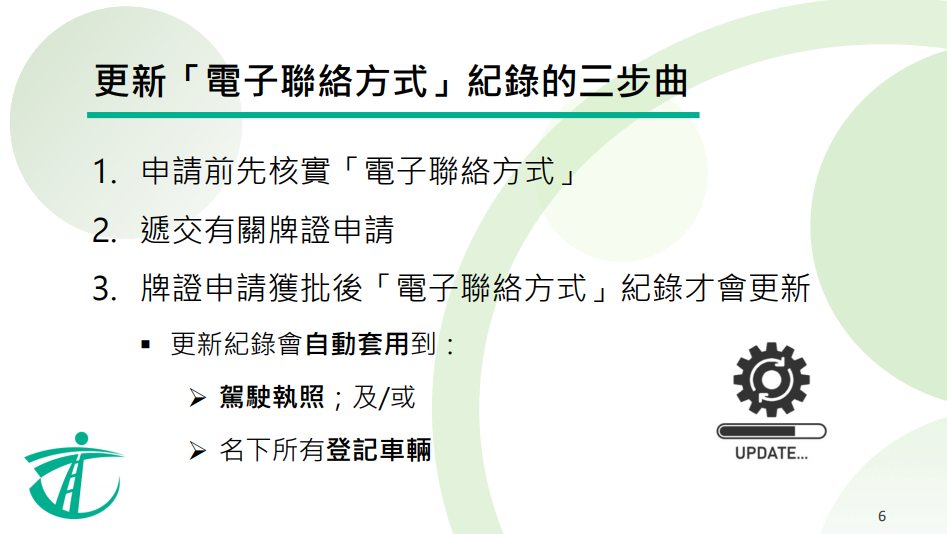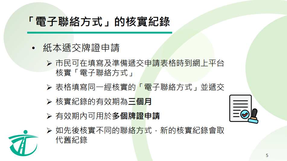 經(jīng)核實的電子聯(lián)絡(luò)方式需待相關(guān)牌照申請獲批後,才會自動更新至其駕駛執(zhí)照及/或名下所有登記車輛的紀錄,以確保紀錄準確更新;