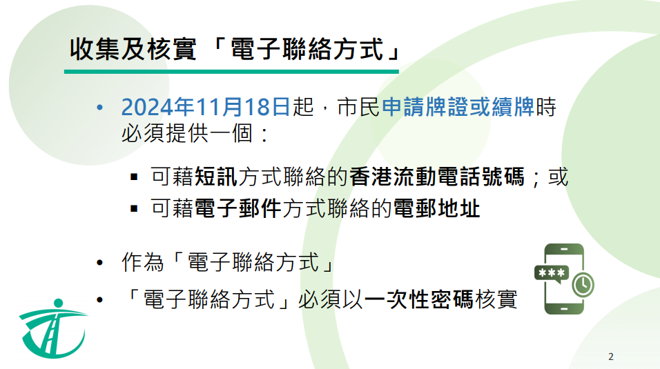 運輸署首席行政主任/牌照電腦計劃及牌照事務(wù)李威儀表示,由今年11月18日起,市民到運輸署申請牌證或續(xù)牌時,必須提供一個可以接收短訊香港流動電話號碼,或一個可以接收電子郵件的電郵地址。相關(guān)「電子聯(lián)絡(luò)方式」必須要以一次性密碼核實,核實方式分別是網(wǎng)上申請,即時核實;或紙本申請後,到指定平臺核實。未來如聯(lián)絡(luò)方式改變,駕駛者需要72小時內(nèi)通知運輸署更改。
