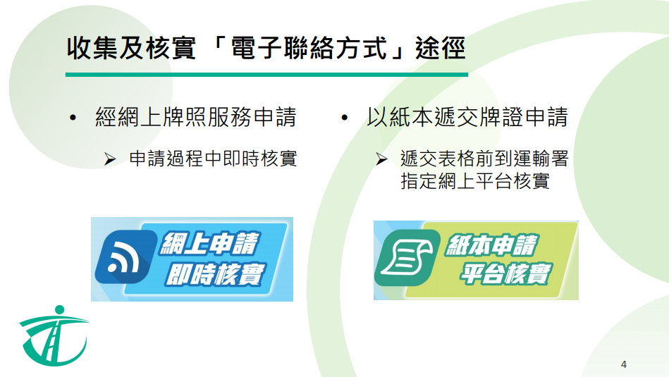 「紙本申請 平臺核實」:如仍需以紙本遞交牌照申請,則須於遞交表格前3個月內(nèi),經(jīng)運輸署指定網(wǎng)上平臺提供並以一次性密碼核實電子聯(lián)絡(luò)方式,再在表格填寫同一經(jīng)核實的電子聯(lián)絡(luò)方式並遞交。指定網(wǎng)上平臺將於11月4日上午10時推出;