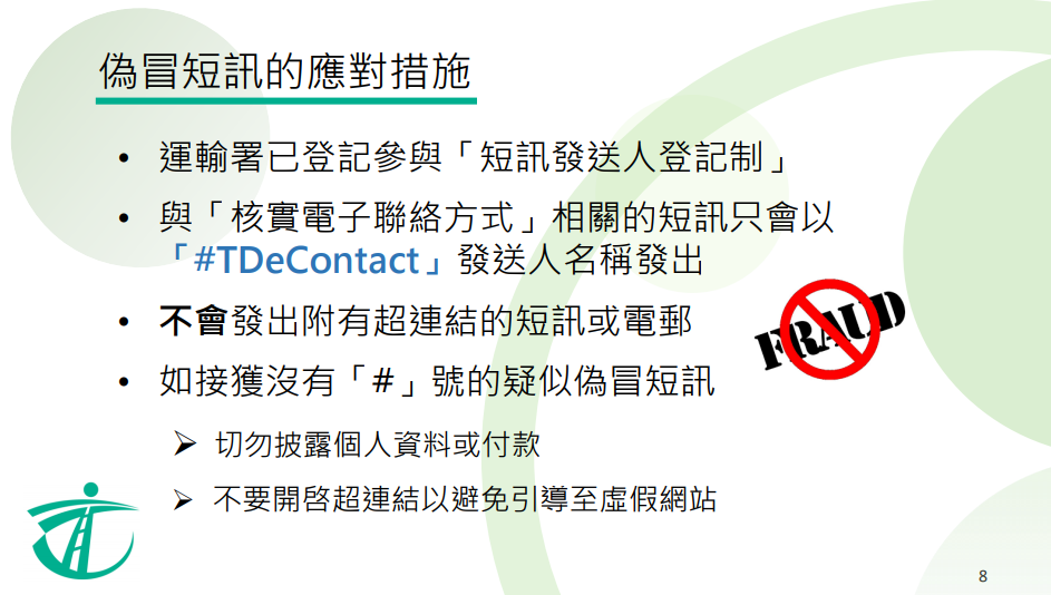 運輸署提醒,以香港流動電話號碼作為電子聯(lián)絡(luò)方式的申請人需注意,署方已參與通訊事務(wù)管理局辦公室「短訊發(fā)送人登記制」,運輸署的短訊只會以附有「#」號的「#TDeContact」發(fā)送人名稱發(fā)出,協(xié)助市民識別真?zhèn)?。運輸署不會發(fā)出附有超連結(jié)的短訊或電郵。如接獲沒有「#」號的疑似偽冒短訊,切勿披露個人資料或付款,亦不要開啟超連結(jié),以避免引導(dǎo)至虛假網(wǎng)站。