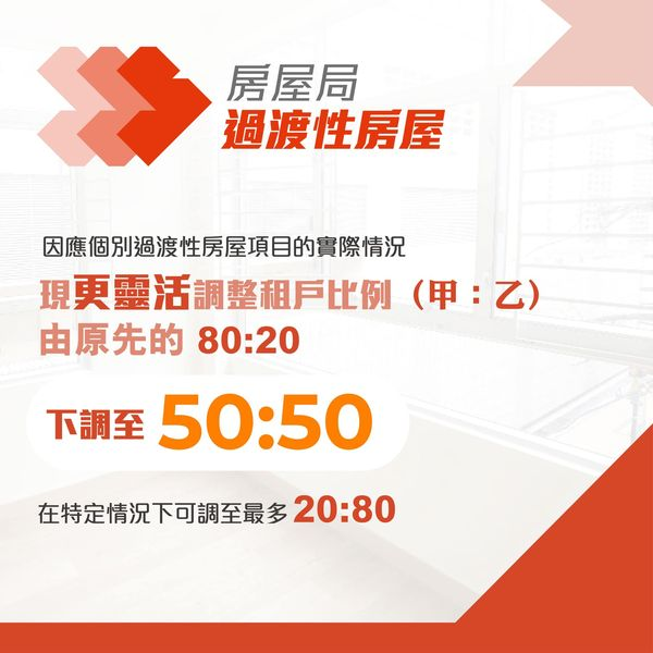 房屋局局長(zhǎng)何永賢今日(10日)在社交平臺(tái)發(fā)文,提到局方由上月底起已向營(yíng)運(yùn)過(guò)渡性房屋的機(jī)構(gòu)公布,因應(yīng)個(gè)別項(xiàng)目實(shí)際情況,可更靈活調(diào)整甲乙類租戶比例,由80:20下調(diào)至最多50:50,進(jìn)一步放寬至特定情況下可下調(diào)至20:80。