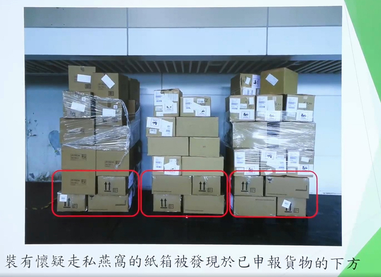 海關(guān)陸路邊境口岸科落馬洲組署理高級督察鍾元方今日(22日)表示,在前日(20日)根據(jù)風(fēng)險評估和情報分析,在落馬洲管制站截查一輛出境中型貨車,在X光掃描期間,發(fā)現(xiàn)在貨斗中間位置的貨物影像有異,懷疑藏有走私貨物,其後打開貨櫃發(fā)現(xiàn)放置在卡板底部的貨物紙箱,與其他紙箱外觀有明顯不同,除包裝較簡陋外,部分更有重新包裝的痕跡,最終發(fā)現(xiàn)一批未列倉單的燕窩,當(dāng)中大部分是高價值的燕棧,合共438公斤,市值3200萬元,並將貨車司機拘捕。