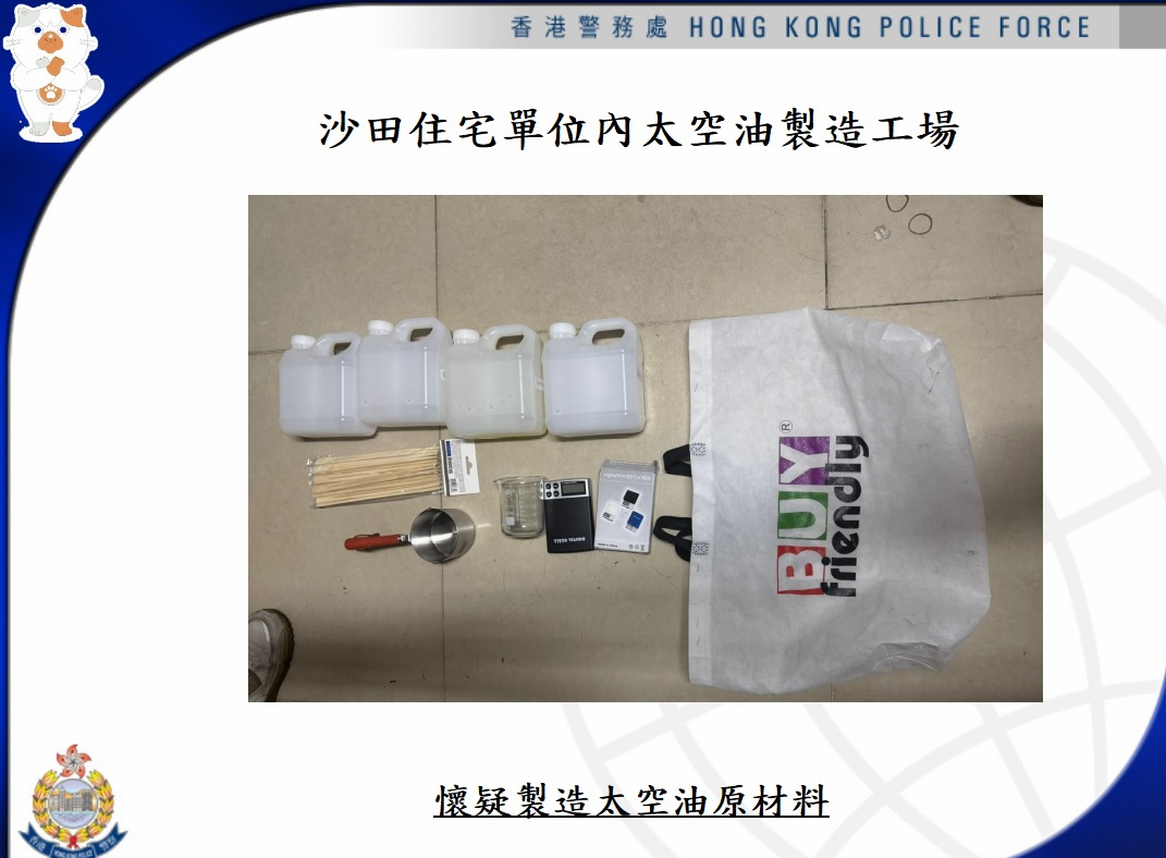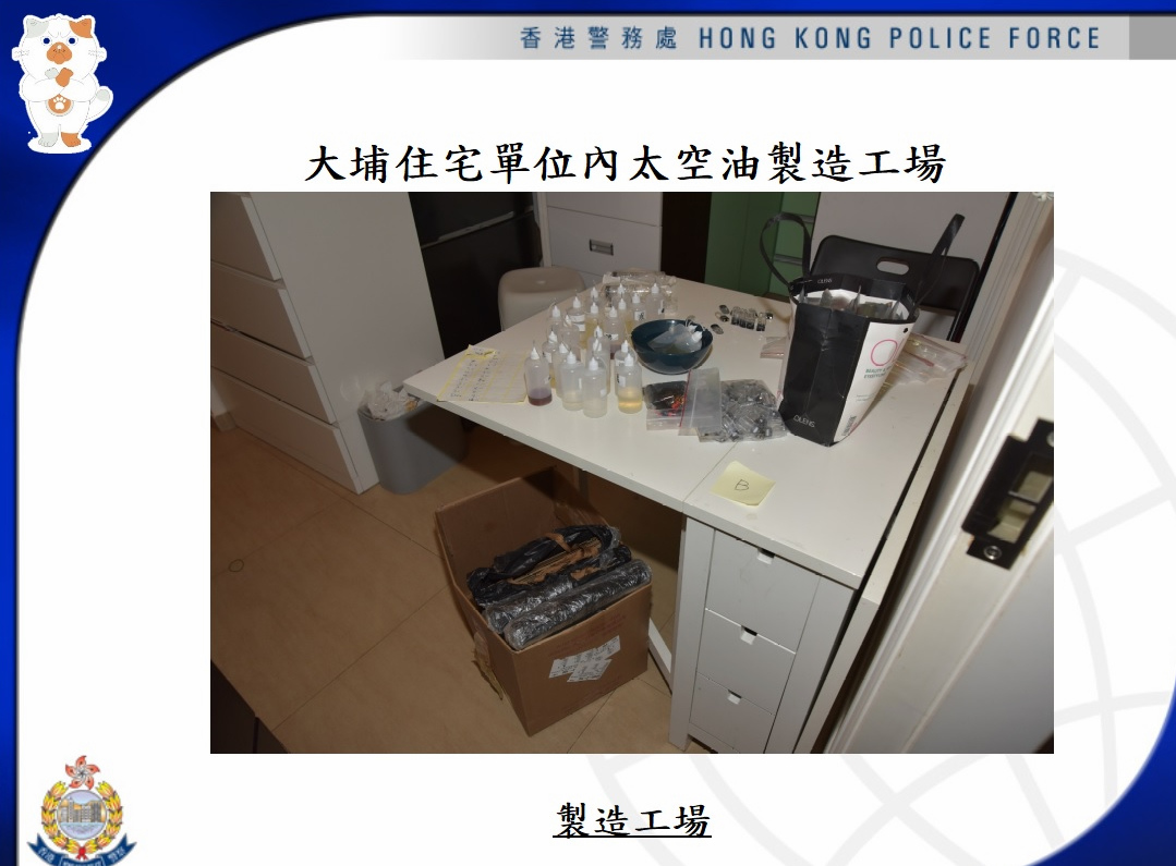 自2023年3月起濫用俗稱太空油的依托咪酯案件有上升趨勢,毒販將大麻和冰毒等毒品混入依托咪酯電子煙中毒害年輕人。警方毒品調(diào)查科昨日(21日)聯(lián)同油尖和葵涌警區(qū)共偵破3宗涉及太空油案件,搗破3個(gè)製毒工場,拘捕5男1女(20至58歲),檢獲2公斤依托咪酯粉末、3公斤太空油、17公斤香味甘油、大量電子煙彈及加工工具,市值約240萬元。