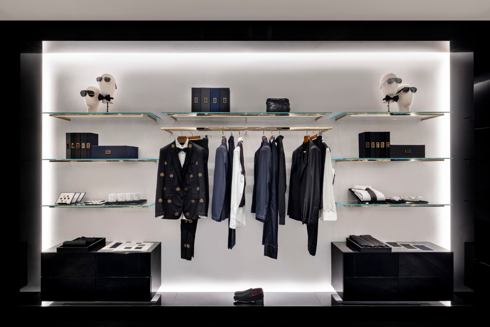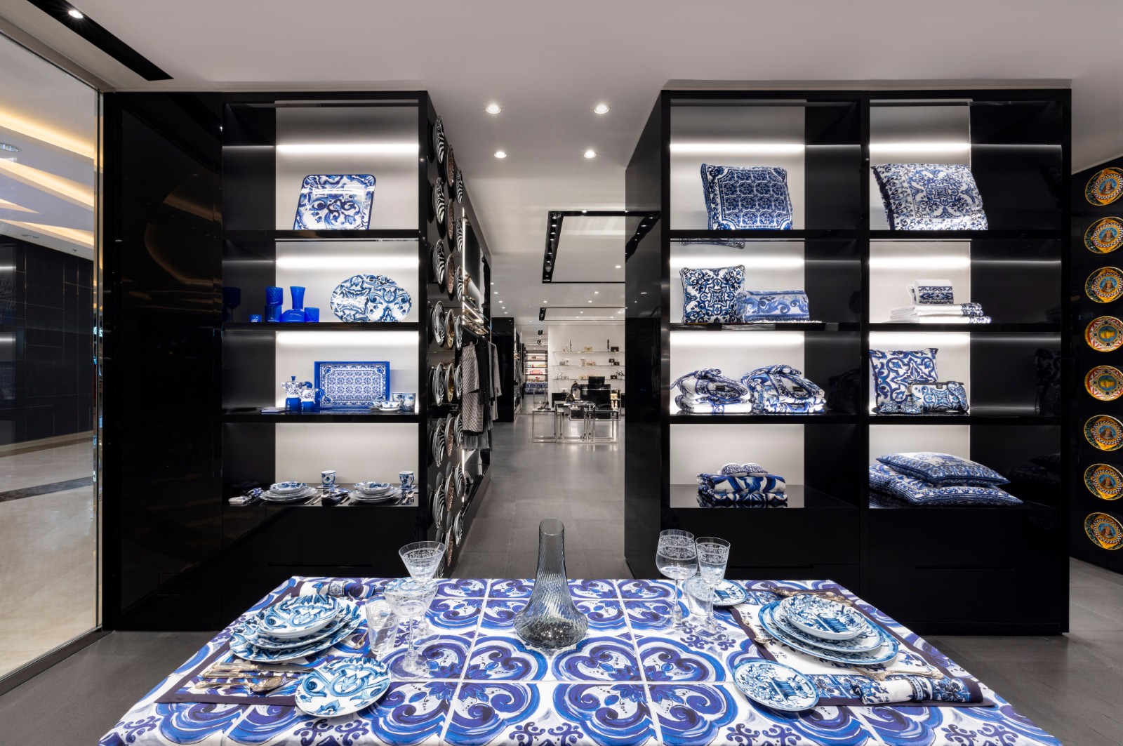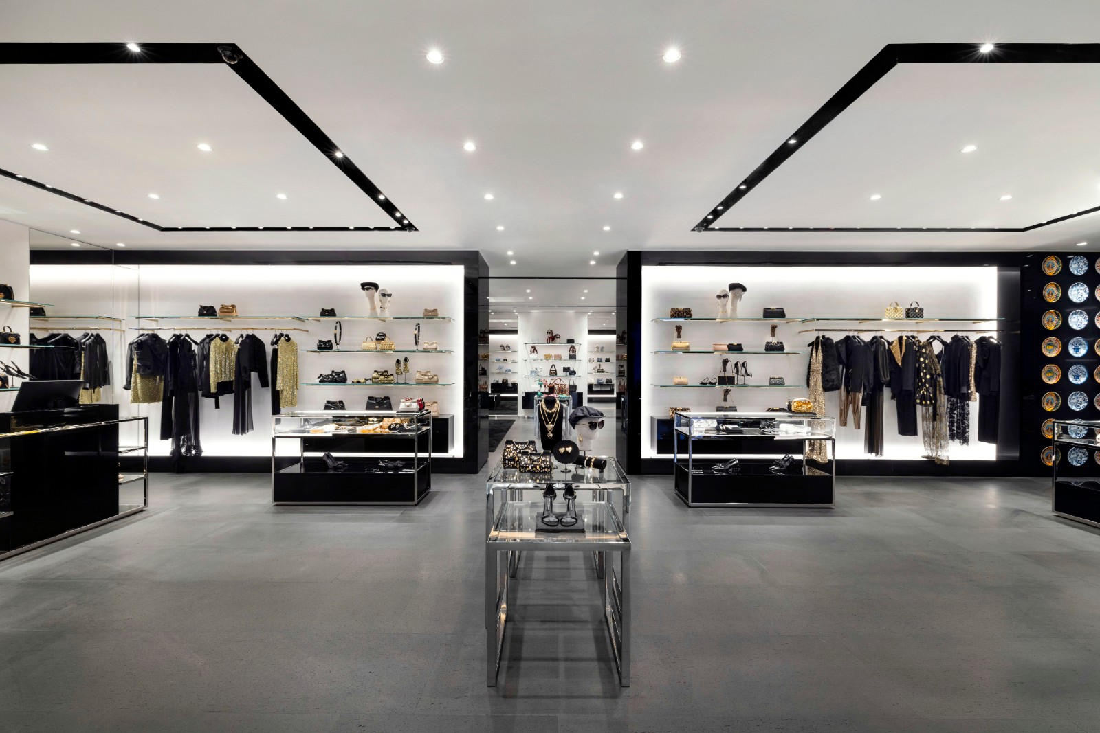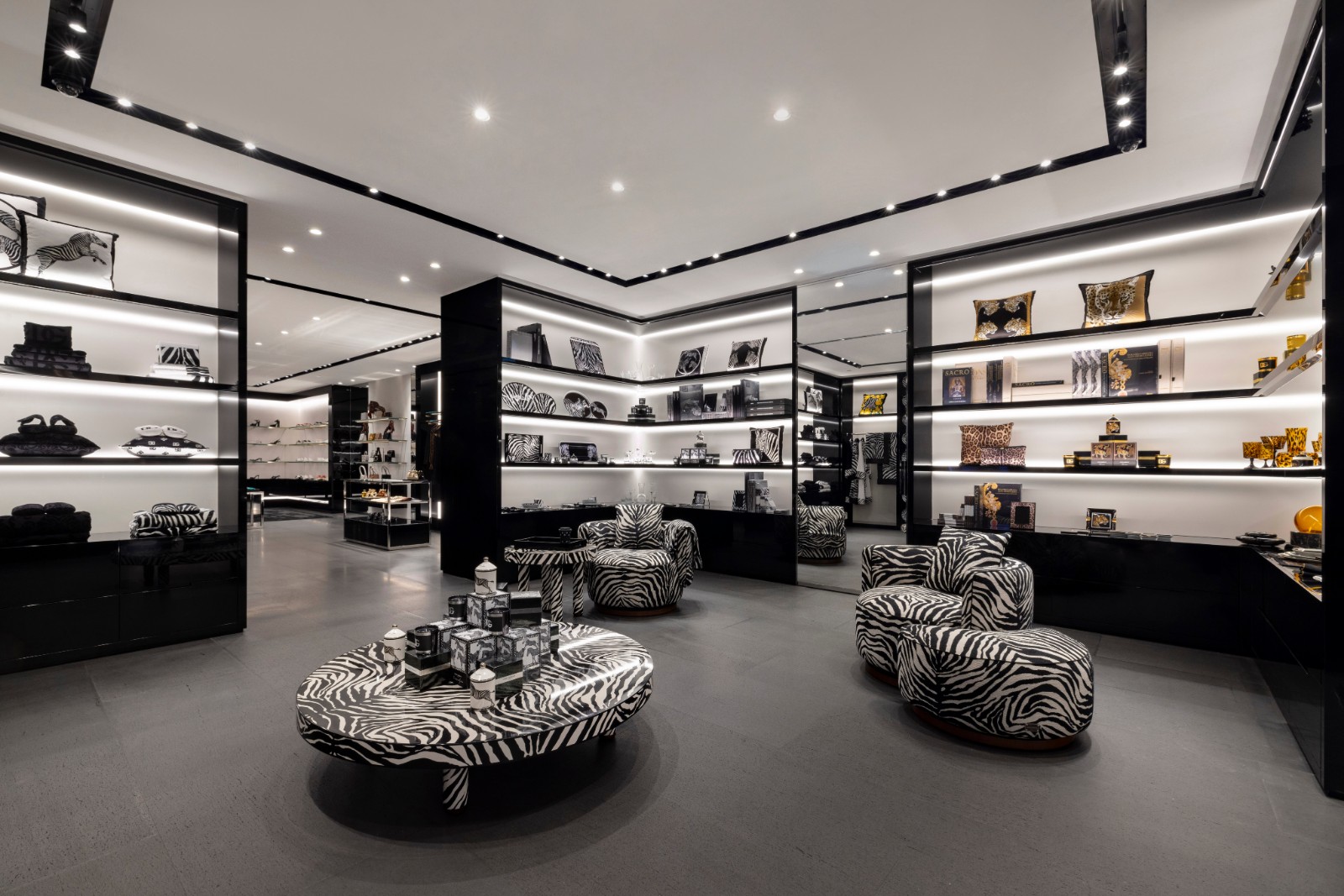 店舖結(jié)合品牌精髓與時(shí)尚高雅品味,處處彰顯其標(biāo)誌性DNA,外牆和地板均採用Basaltina火山巖石點(diǎn)綴。店內(nèi)的牆壁以黑色亮漆為主調(diào),與白色的灰泥牆和全身鏡形成鮮明對(duì)比。加上黑色毛呢軟墊座椅、覆蓋明亮鏡面的陳列櫃,及綴以金屬飾面的家具,營造出寬闊高雅的購物空間,男裝和女裝系列的衣服配飾均區(qū)隔分明且具特色。店內(nèi)還設(shè)珠寶專區(qū),Casa系列的家具則陳列於專門店的正中間位置。 (記者、部分圖片:Janice)