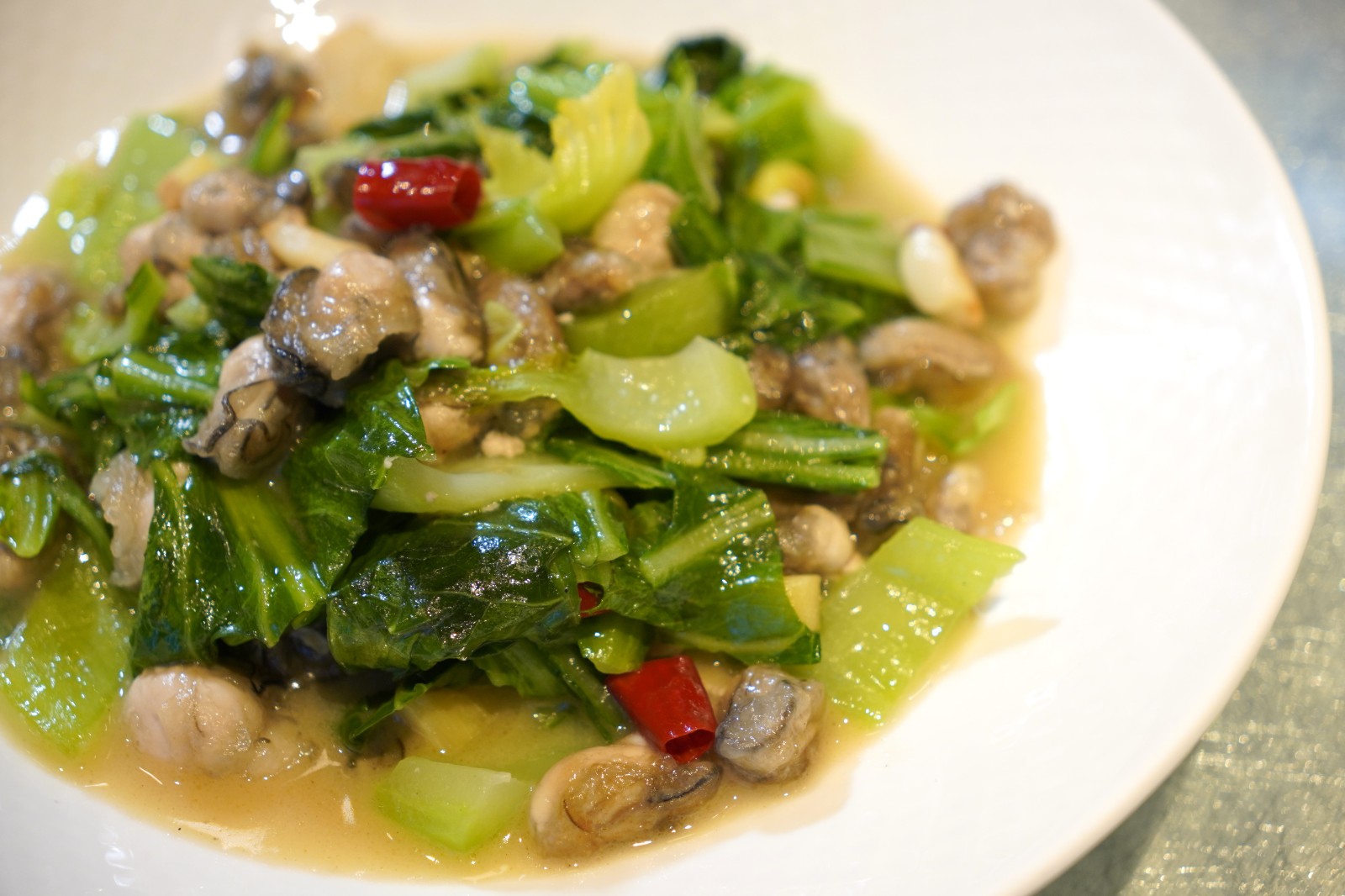 餐廳推出共七種海蠣菜餚,一次點(diǎn)選兩道HK$218,如富當(dāng)?shù)靥厣母=ㄌ厣O牸濉⑥r(nóng)家海蠣湯、九層塔香燜海蠣等。若喜清淡口味,推介兩款新菜式芥菜燒海蠣及蒜青炒海蠣,前者將當(dāng)造的芥菜與鮮嫩的海蠣結(jié)合,甘甜清脆的芥菜提升了海蠣的鮮味,後者屬福建家常菜,鹹香入味,蒜香撲鼻。重口味的食客推介辣子鮮海蠣,每顆海蠣裹上薄薄的天婦羅麵糊酥炸,外層酥脆內(nèi)裏的海蠣依然保持脆嫩味鮮,配合重慶辣椒和自家熬製花椒油,香辣惹味。黑松露海蠣燒豆麵則將山海雙珍融合,海蠣熬煮的湯底鮮香,黑松露的加入增添濃郁風(fēng)味,兩者被豆麵吸收,爽滑入味。