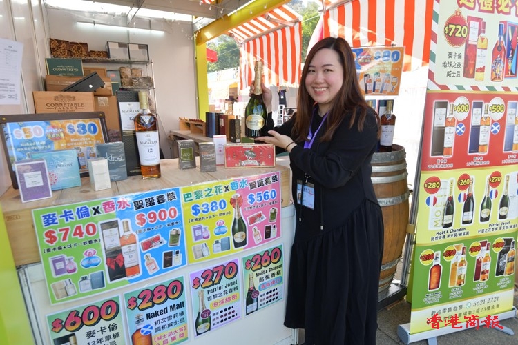 陳瀅就指,早前參加過葵涌美食展,反應(yīng)非常熱烈,有10元紅酒,每日限量40支,當(dāng)時已很受歡迎,故再次推出有關(guān)優(yōu)惠,並希望銷情比葵涌美食展翻一倍。她還介紹到香檳配香水的套裝,是特意在工展會推出這構(gòu)思,因臨近聖誕,香水是很多人購買聖誕禮物的心水,每日限購10套,陳瀅則推介麥卡倫配香水套裝,前者是大品牌,有漂亮禮盒,而平常一支香水在專門店要2000元,但現(xiàn)時一套合計900元,是非常吸引,並只預(yù)備100套發(fā)售,先到先得,售完即止。(圖:崔俊良攝)