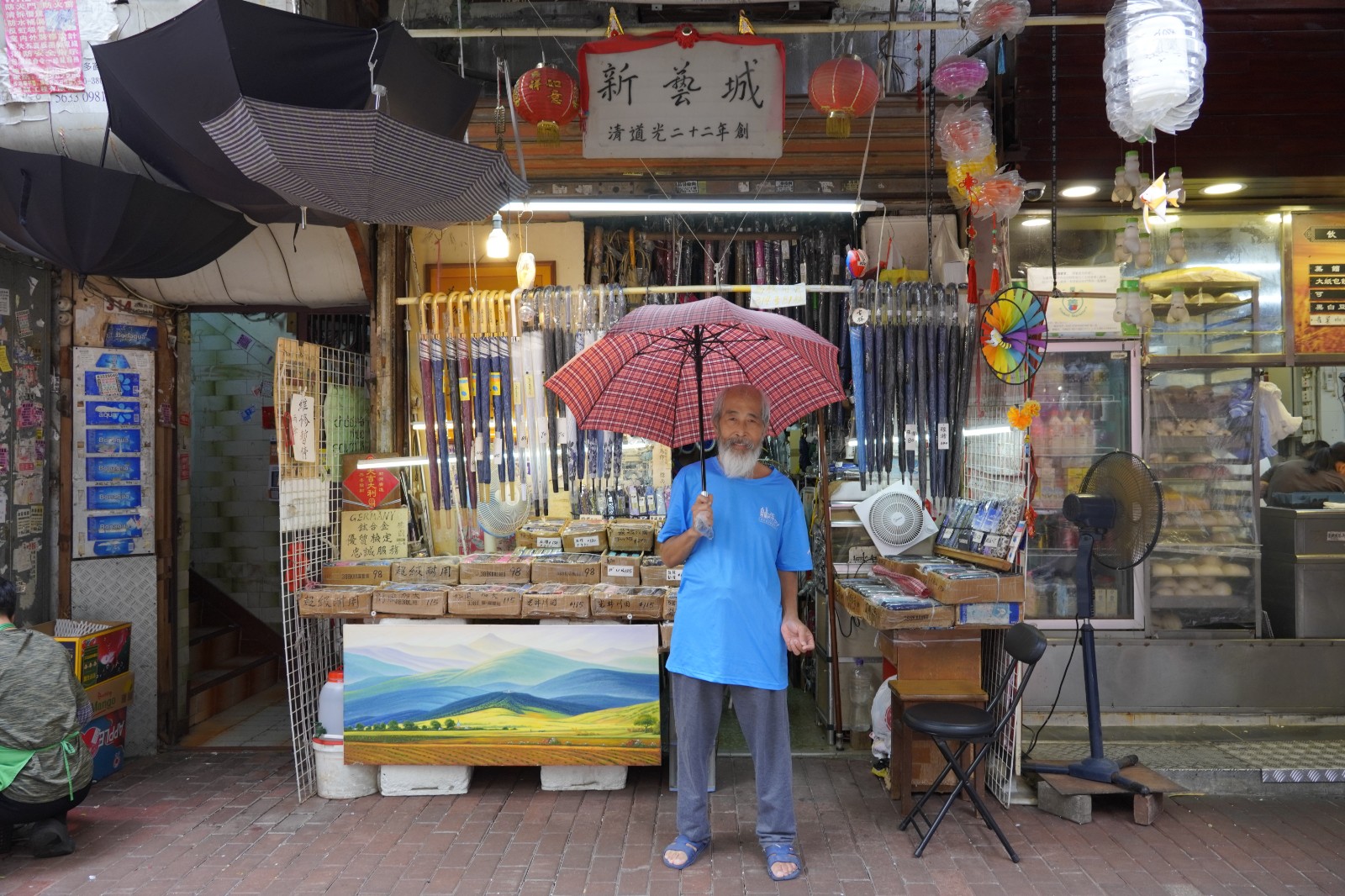 屈身於小店,威哥能從生活小事聊到歷史大事,無所不說。他憶述,曾經(jīng)有一位婆婆誤以為他提供免費修傘服務(wù),帶了一把女兒送的卡通傘來,當知道要收費後竟氣得把傘丟到店前離去?!赶氩坏侥前褌阄肆硪晃粊碣I傘的女士注意。我把婆婆的事告訴她,她縱然不認識婆婆,卻表示願意替對方繳付修傘費,託我把傘修好?!雇绺袣U,老太太一直沒有前來取回雨傘,那把卡通傘現(xiàn)時仍留在店內(nèi),一晃眼已經(jīng)30年了。威哥通過維修雨傘,遇見許多故事,有開心的有受氣的,陰晴不定風(fēng)雲(yún)萬變。唯一不變的,是他總能在傘的護蔭下,找到安靜平和。