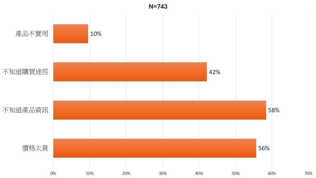 圖四、受訪者認(rèn)為阻礙他們應(yīng)用樂齡科技產(chǎn)品的主要因素包括:不知道產(chǎn)品資訊、價(jià)格太高、不清楚購(gòu)買途徑、產(chǎn)品不實(shí)用,部分受訪者則表示生活空間不足,影響他們使用樂齡科技。