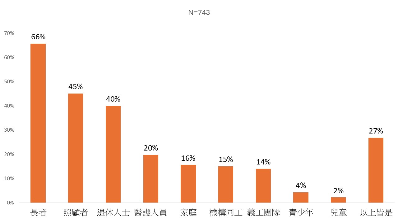 圖八、受訪者認(rèn)為長(zhǎng)者及照顧者是最重要的教育對(duì)象,四成受訪者認(rèn)為退休人士也需學(xué)習(xí)樂齡科技。