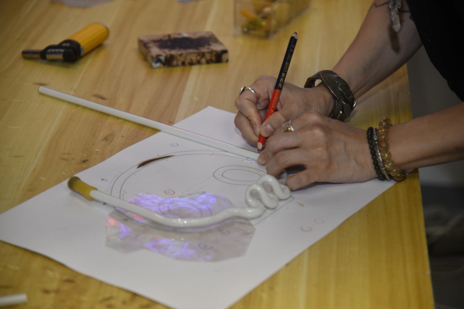 將玻璃燈管放在設(shè)計(jì)圖上比對(duì)位置,並用筆在燈管上畫記號(hào)。