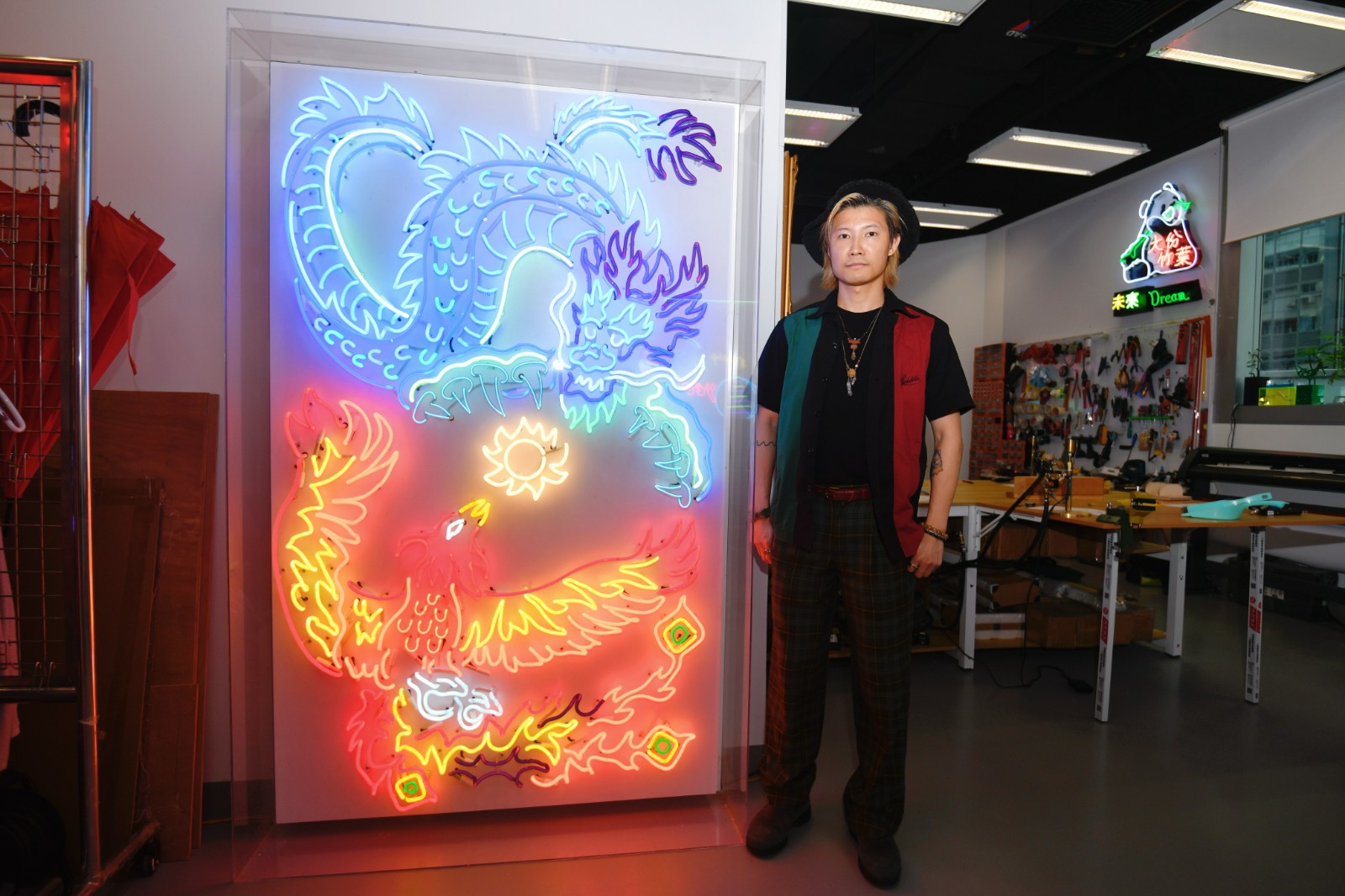 霓虹藝術(shù)家劉浩輝與他兩年前創(chuàng)作、兩米高的《Lost and Found —Dragon Phoenix》。作品以光管將龍鳳圖案勾勒,色彩富有層次,令靜態(tài)畫面猶如動(dòng)起來。