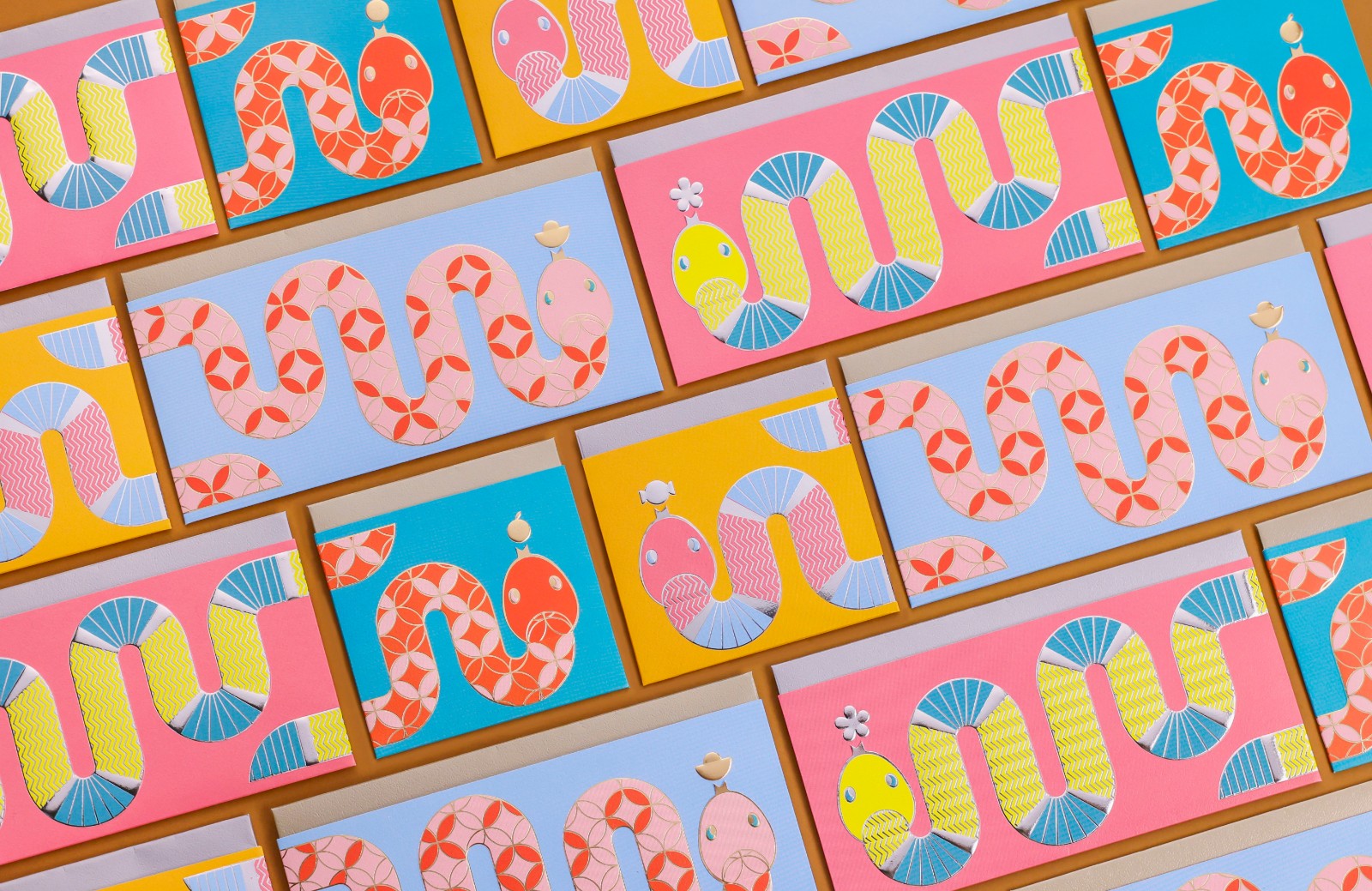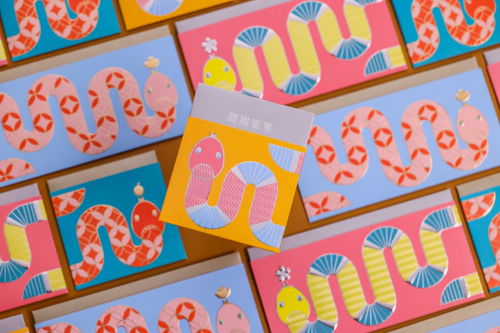 設(shè)計(jì)玩味的「喜蛇迎春」利是封以「貪食蛇」為主題,靈巧多變的「貪食蛇」會(huì)呈現(xiàn)於利是封之上,取其邁向目標(biāo)持續(xù)成長(zhǎng)和進(jìn)步,寓意新年步步高陞、財(cái)富和幸福滿載。利是封巧妙融入了動(dòng)態(tài)機(jī)關(guān),向上拉開將會(huì)展現(xiàn)賀年祝福語句,包括「花開富貴」、「大吉大利」、「甜甜蜜蜜」及「招財(cái)進(jìn)寶」,同時(shí)兼?zhèn)浠?dòng)性和高雅貴氣。蛇頭上方分別印有分別象徵招財(cái)進(jìn)寶、大吉大利、甜甜蜜蜜、花開富貴的金元寶、桔、糖果和迎春花,寓意蛇年好運(yùn)齊來及增添福氣。利是封反傳統(tǒng)採(cǎi)用活潑繽紛的顏色,包括桃紅、橘黃、翡翠綠及粉藍(lán),並以能凸顯蛇身別致紋路的蛋殼紙,配富質(zhì)感、立體度的3D浮雕印刷,設(shè)計(jì)精巧,向摯愛親朋送上新年祝福之餘,也具收藏價(jià)值。