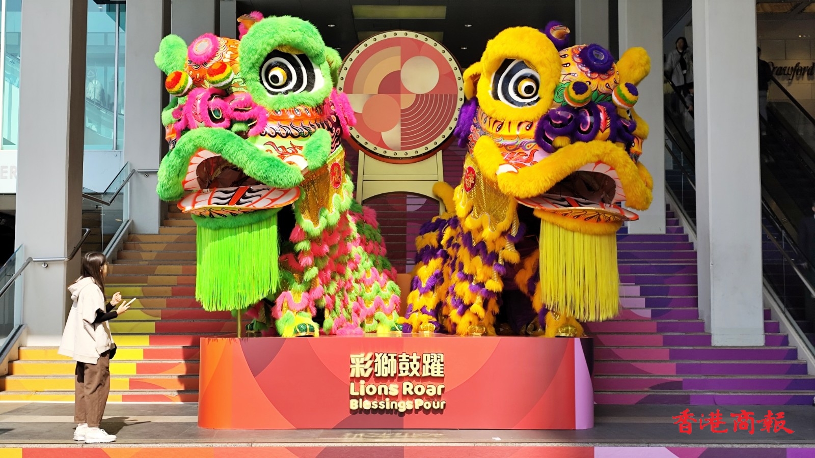 此外,海港城海運大廈正門添上歡樂喜慶的裝束。大樓梯貼上色彩奪目的大型「8」字吉祥圖騰,兩頭3米高的巨型黃色及青色醒獅更在入口恭迎大家,寓意左右逢源、得心應(yīng)手、一帆風(fēng)順。祝願大家穿過樓梯後,在新一年發(fā)展順利,步步高升,發(fā)光發(fā)熱又發(fā)財。