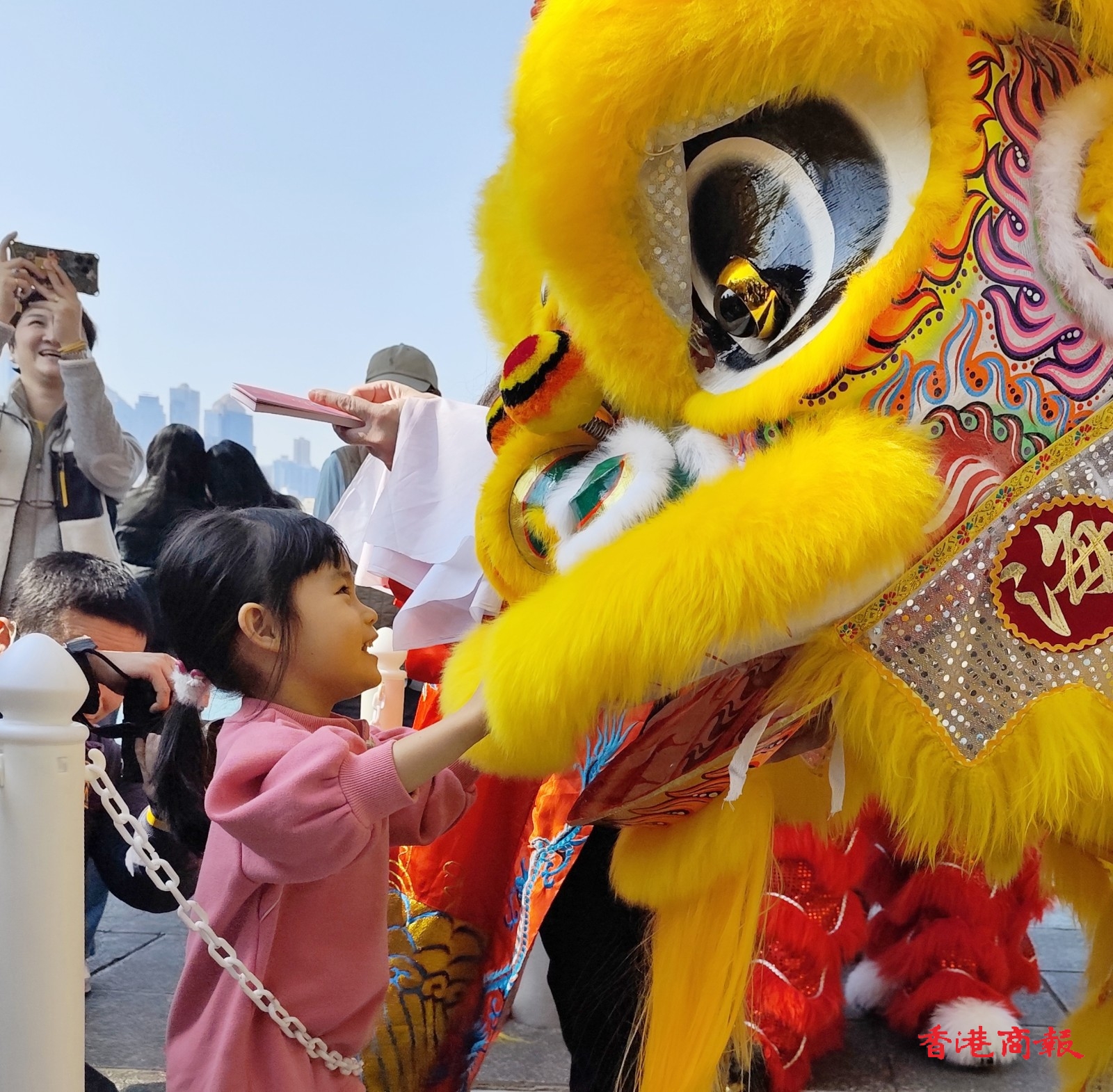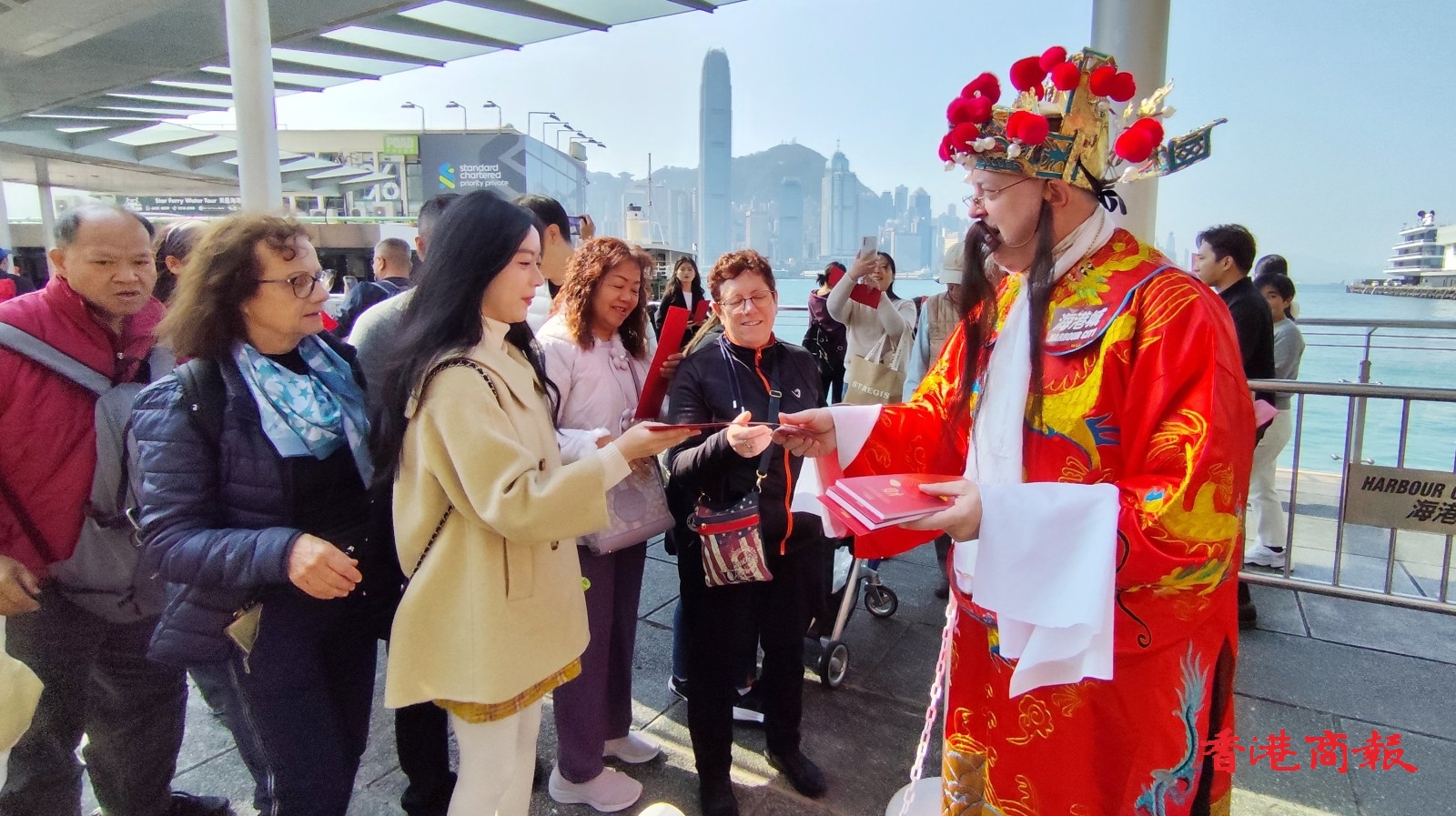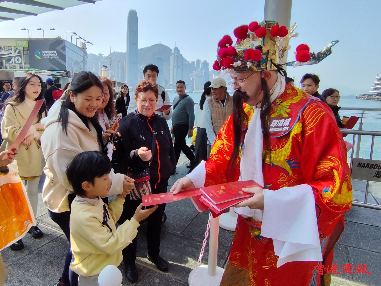 今日(10日)大會安排「財神」大派利是封,吸引不少市民遊客索取。(記者 馮瀚文攝)