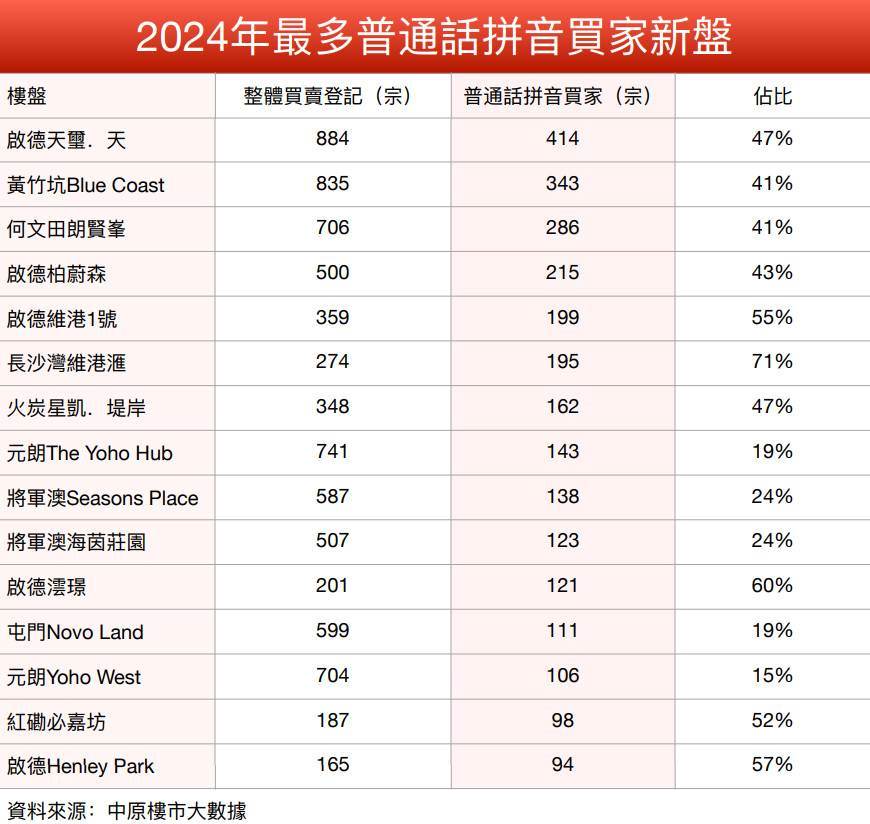選取去年首15個(gè)(見表)最多普通話拼音買家新盤,新地(016)有4個(gè)新盤上榜,包括啟德天璽?天、元朗The Yoho Hub、屯門Novo Land及天水圍Yoho West,合共錄得774宗該類客入市,佔(zhàn)售出單位2928伙的26%。其中天璽?天售出884伙,近一半買家、即414宗屬該類客,是去年最多「國語客」追捧新盤。其次是黃竹坑站上蓋港島南岸Blue Coast,錄343宗;之後是何文田朗賢峯及啟德柏蔚森,分別有286及215宗。