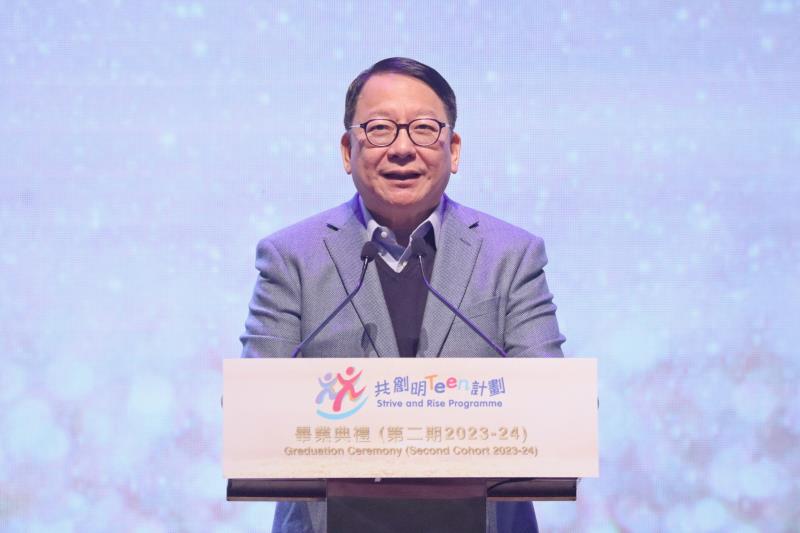 第二期共創(chuàng)明「Teen」計劃今日(12日)舉行畢業(yè)典禮。政務司司長陳國基致勉詞,今天的畢業(yè)典禮其實不是一個完結,是人生一個開始,他對各位學員非常有厚望,並感謝各位友師,他們可用偉大來形容。香港之所以成為香港、之所以成功,其實是很多有心的人,這些有心人絕對包括在座各位友師。陳國基更希望各位畢業(yè)學員能加入校友會,期望能做到陪伴各位成長,而共創(chuàng)明「Teen」計劃進入第三年,這計劃非常有意義,對學員來說能擴闊視野、跟友師學多點東西,是將來他們成功的一個基礎,同時希望共創(chuàng)明「Teen」計劃可繼續(xù)發(fā)光發(fā)亮,幫到所有有需要年輕人。