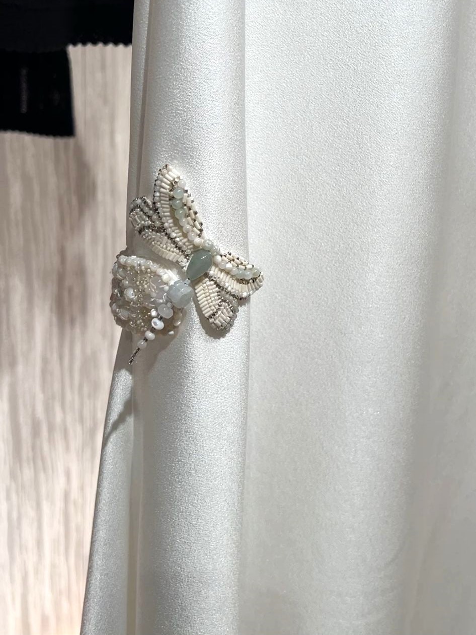 本季色系透過卡其與嫩羽黃,以中性色解放了筆墨的沉重,保留東方清透的白裏紅為亮點。系列運用大量異素材、輕量毛料流蘇、漆面,凸顯毛筆飛舞柔繪、素描筆觸,在借鑒上世紀20年代直筒、低腰無腰線的服裝輪廓下,風格輕快不張揚。此外,「蜻蜓」與「鳶尾花」成為本季靈魂,呼應著點篝與筆,衣服上可見簍空蜻蜓雕花、黃玉白貝花黑瑪瑙縫製蜻蜓、大面積鳶尾花刺繡圖騰,精細工藝下呈現(xiàn)輕如點水的「筆痕」。