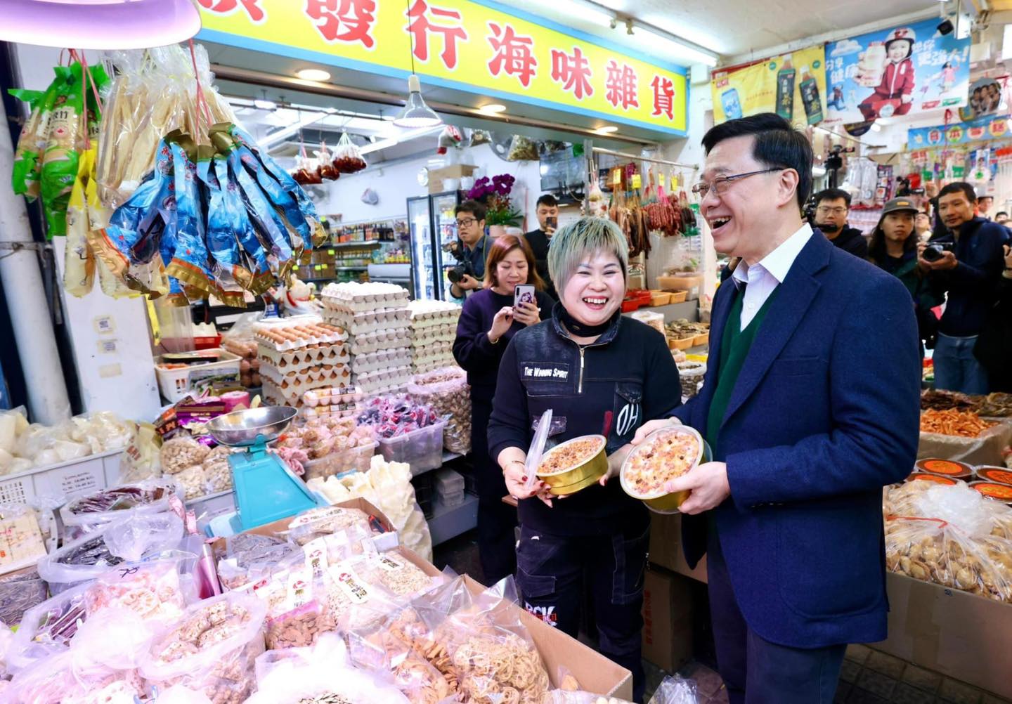 探訪愛民邨家庭後,李家超在附近兜了一圈,了解店舖生意情況,指看到不少商店出售年貨,有市民一家大小都在辦年貨,年味濃濃。
