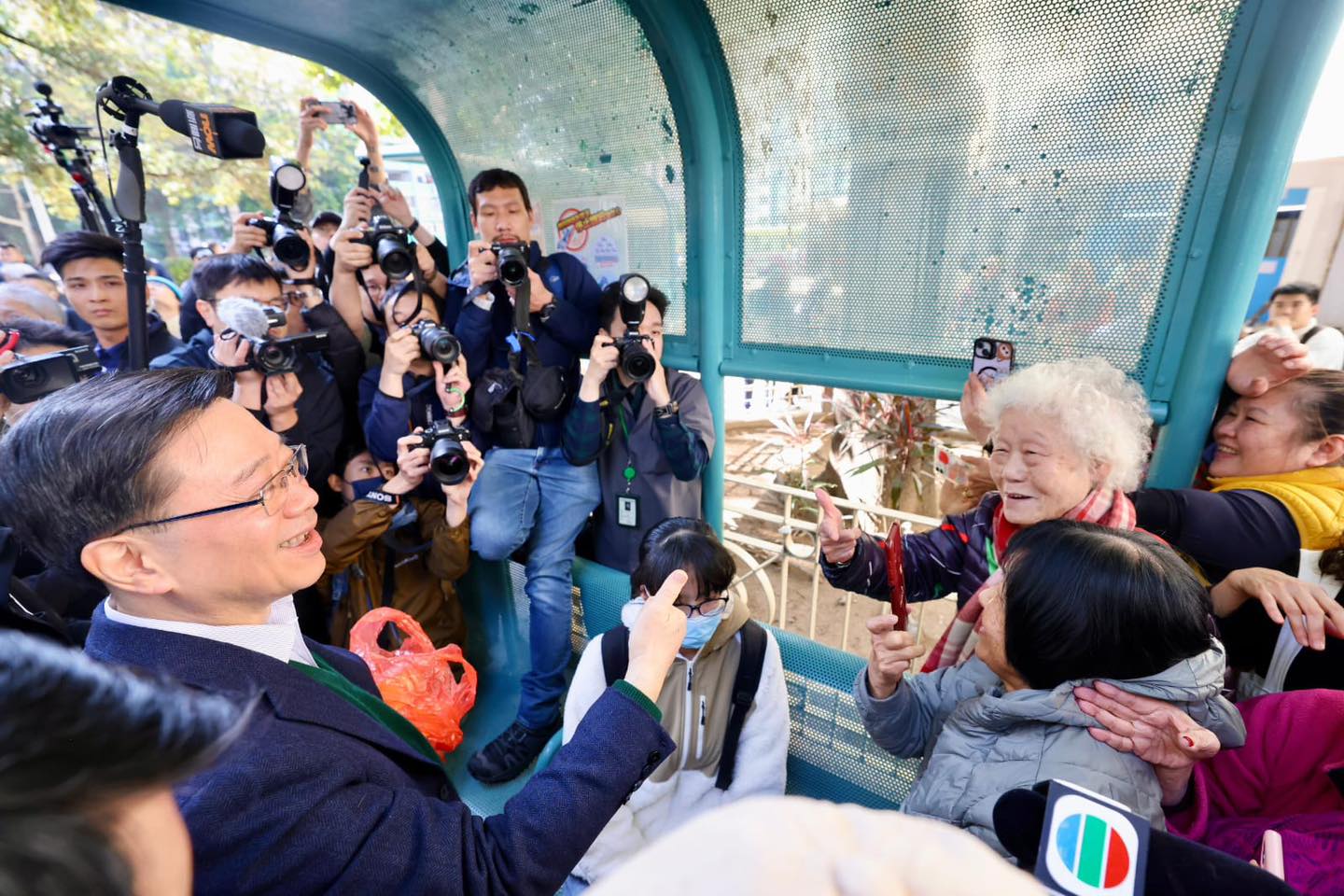 李家超又指,他有向商戶了解,得悉生意符合預(yù)期。他又與街坊傾談及合照,了解區(qū)內(nèi)交通及社區(qū)環(huán)境等。與長(zhǎng)者傾談期間,李家超祝福他們身體健康,稱如有需要,關(guān)愛隊(duì)可隨時(shí)協(xié)助。