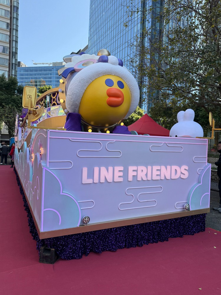 LINE FRIENDS花車的設(shè)計(jì)創(chuàng)意來自靈蛇換鱗散發(fā)出耀眼光芒意象啟發(fā),整個(gè)車身大膽地使用很多Y3K風(fēng)格配色和設(shè)計(jì)元素,將新年元素重新演繹。至於LINE FRIENDS花車用帆船作為結(jié)構(gòu),船身旁邊用祥雲(yún)做海浪設(shè)計(jì),配合LED燈飾,營(yíng)造出LINE FRIENDS一起踏上閃耀蛻變旅程的象徵意義?;ㄜ嚿厦嬗昧思t帶頭套外形結(jié)合中國(guó)一個(gè)合體字:「招財(cái)進(jìn)寶」,船頭有卡通人物戴了舞獅頭套,給各位鴻運(yùn)當(dāng)頭祝福。
