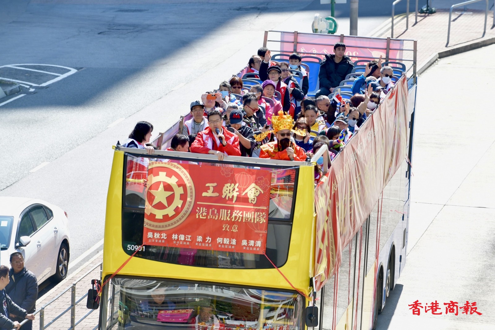 據(jù)了解,花車從小西灣出發(fā),工聯(lián)會一眾人員於巡遊巴士上向途人打招呼和拜年,市民紛紛予以回應(yīng)。