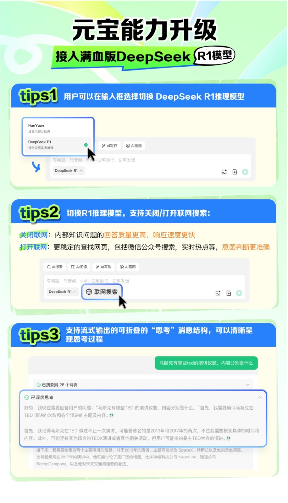 2月13日,騰訊AI助手「騰訊元寶」迎來重大更新,同時支持混元和DeepSeek兩大模型,打開騰訊元寶並進入對話界面,即可免費使用DeepSeek-R1滿血版模型。