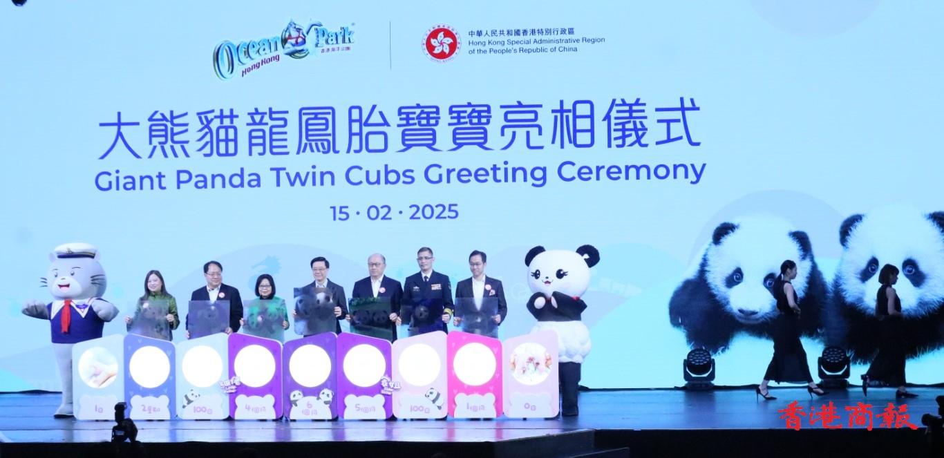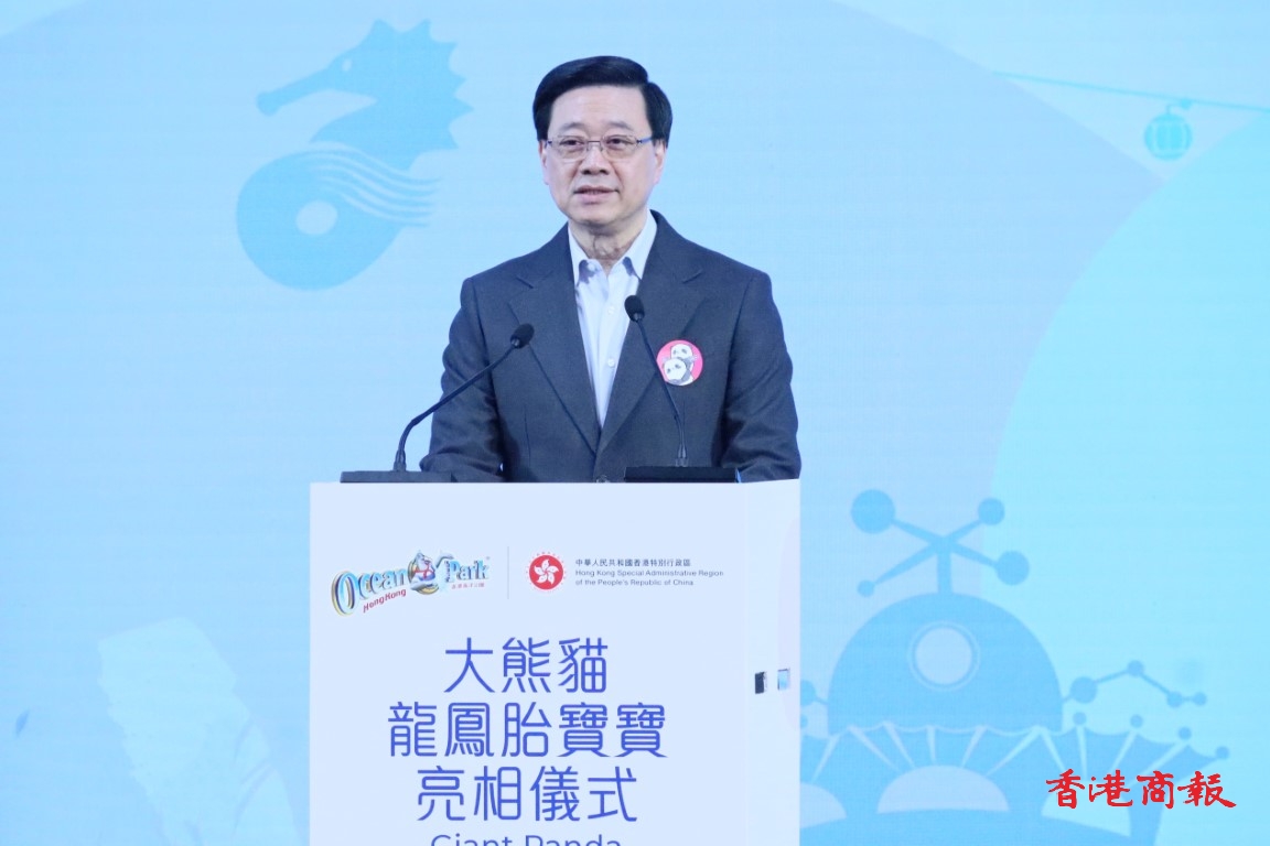 行政長(zhǎng)官李家超在大熊貓龍鳳胎寶寶亮相儀式致辭。
