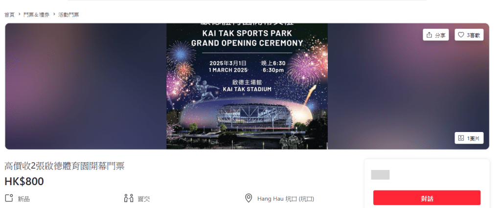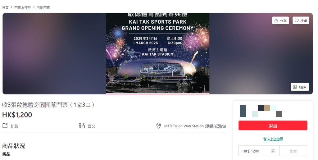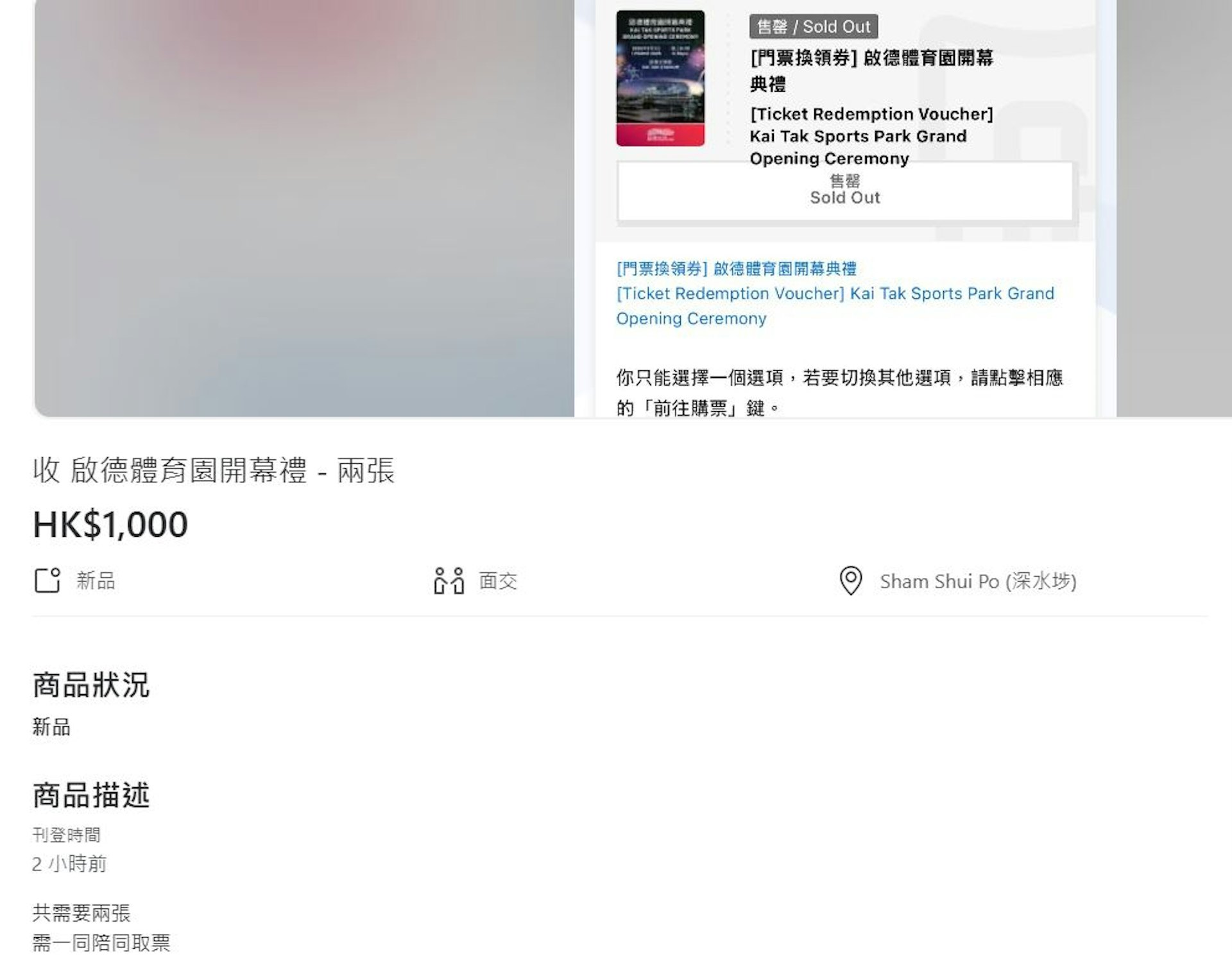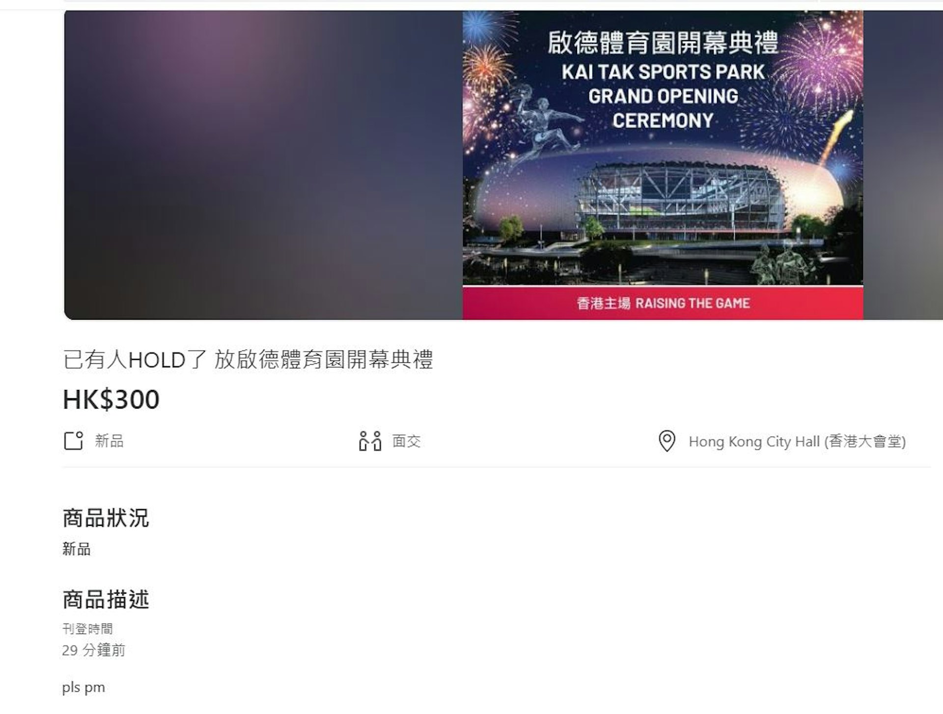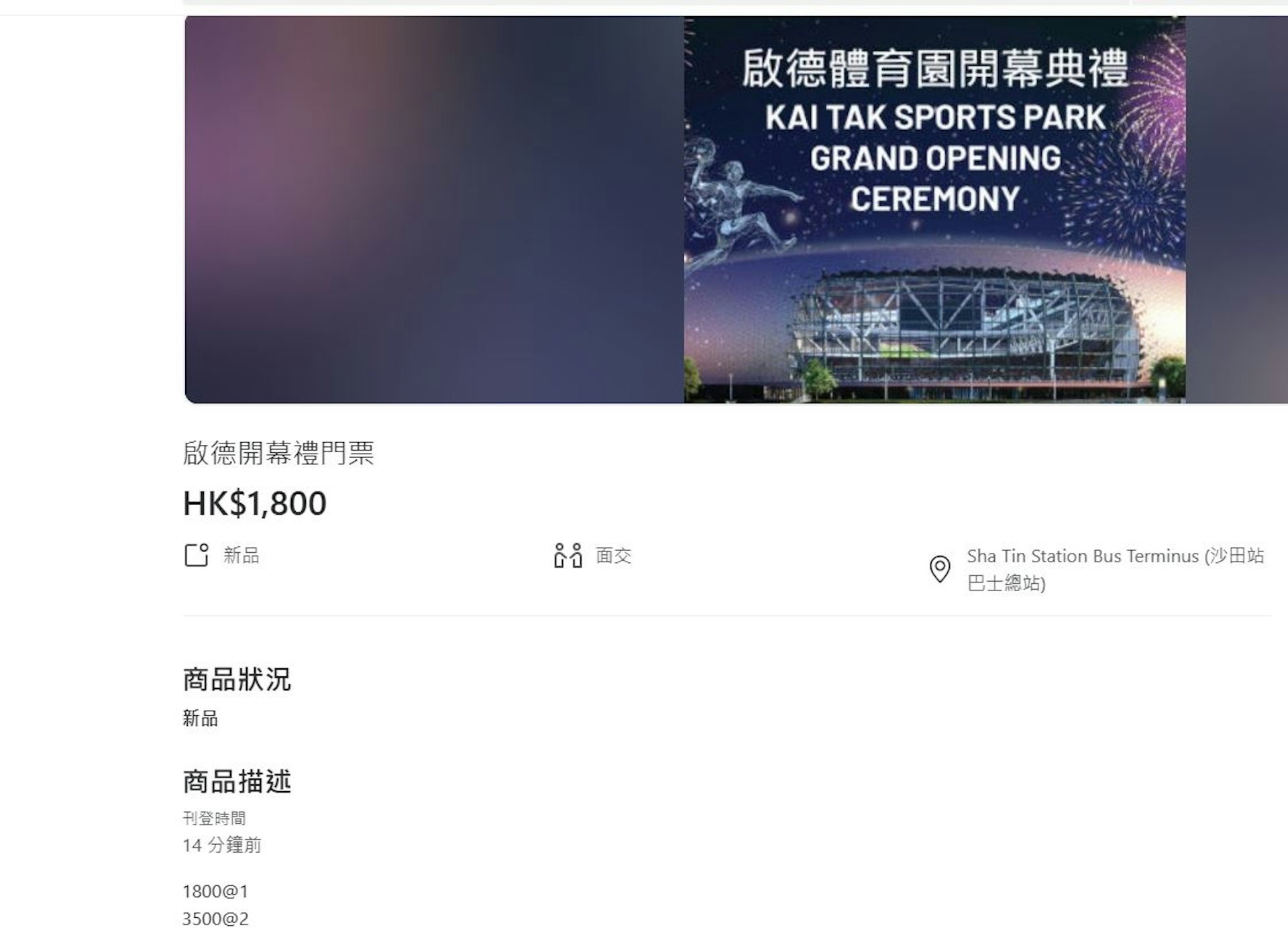 根據(jù)網(wǎng)上交易平臺(tái)顯示,有多張啟德體育園開(kāi)幕禮的門票發(fā)售,售價(jià)由300至1800元一張不等,2張售3500元,較原價(jià)10元貴180倍;亦有未能買到票的人在平臺(tái)收門票,收價(jià)約為400元一張。