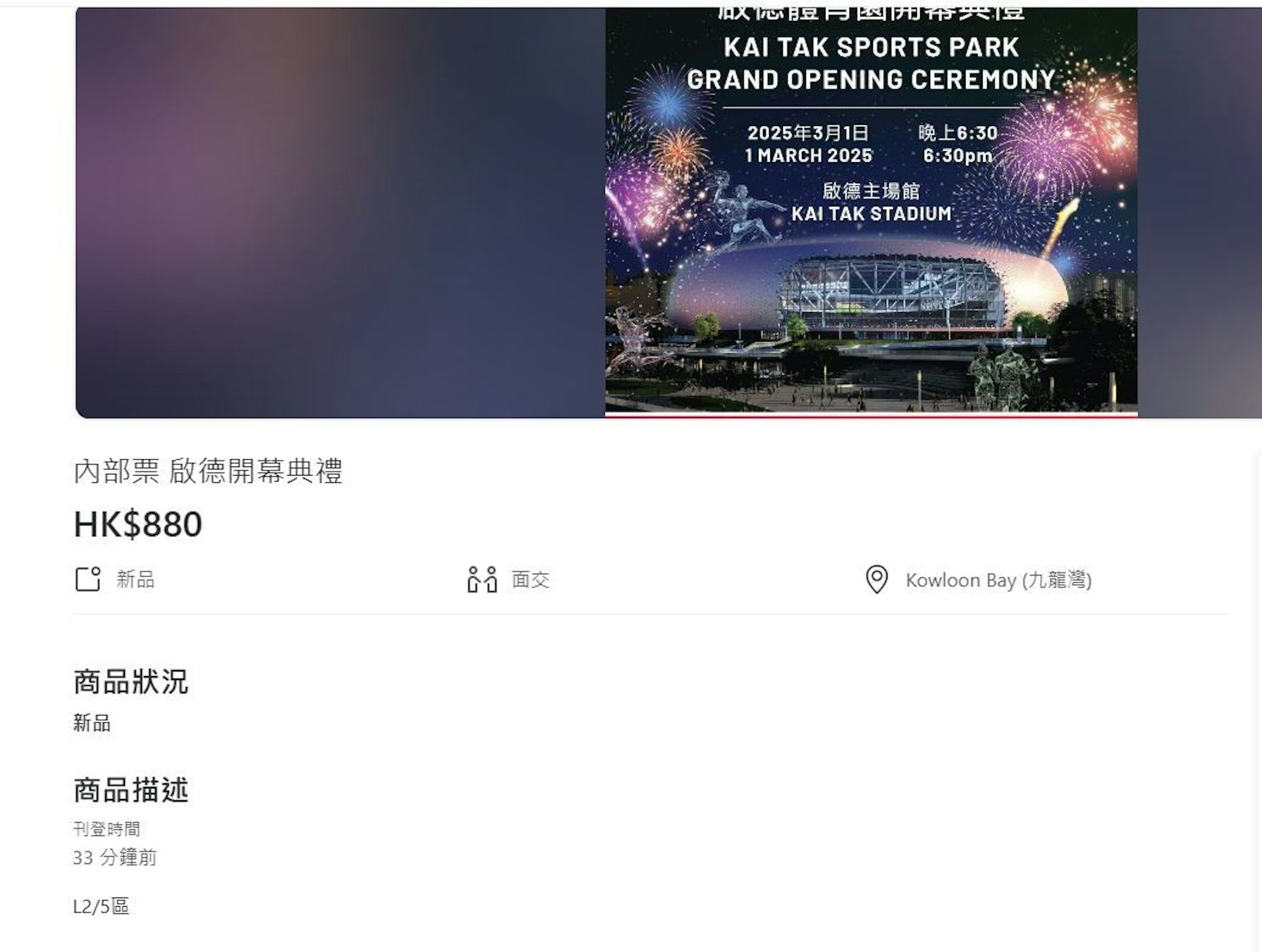 啟德體育園3月1日開(kāi)幕禮的8500張公眾門票今早(21日)10時(shí)開(kāi)售,約半小時(shí)就已全部售罄。惟網(wǎng)上交易平臺(tái)即刻出現(xiàn)炒賣「黃牛飛」情況,標(biāo)價(jià)最高達(dá)1800元。