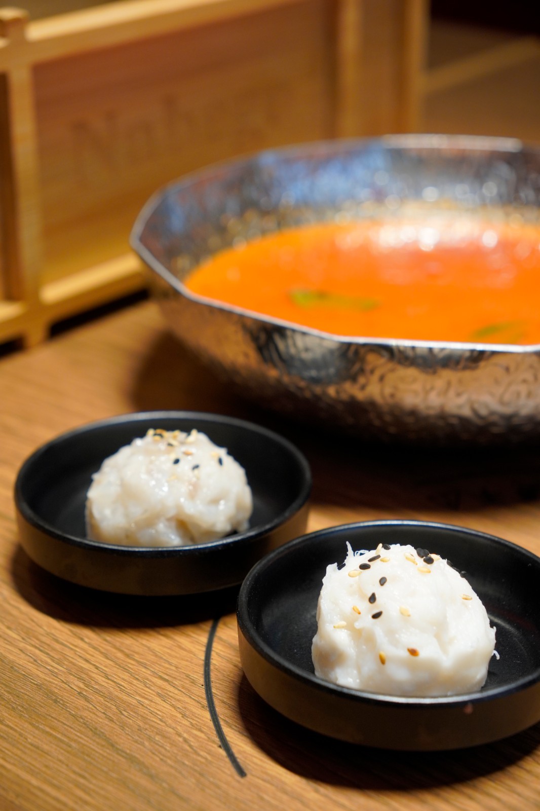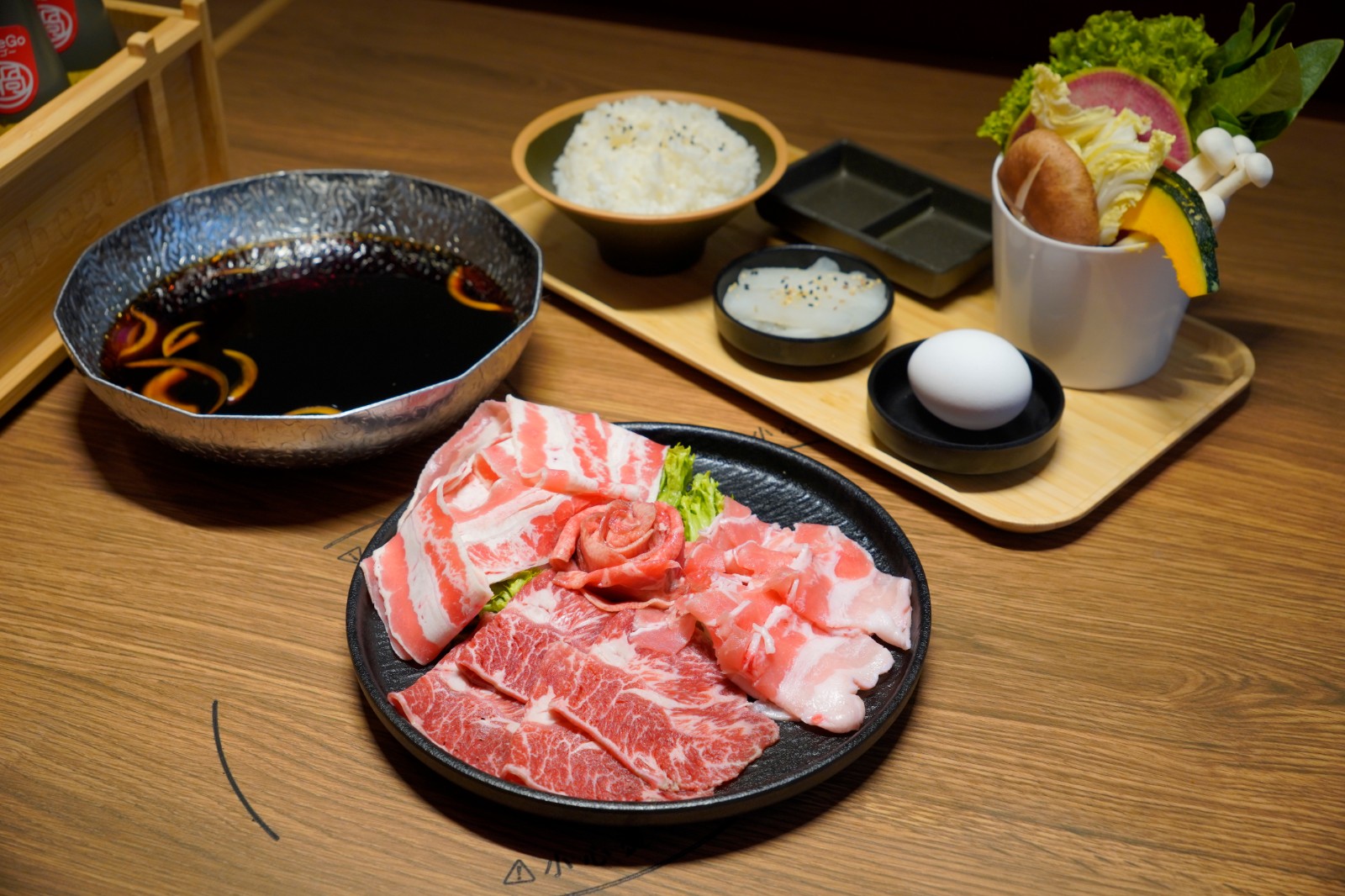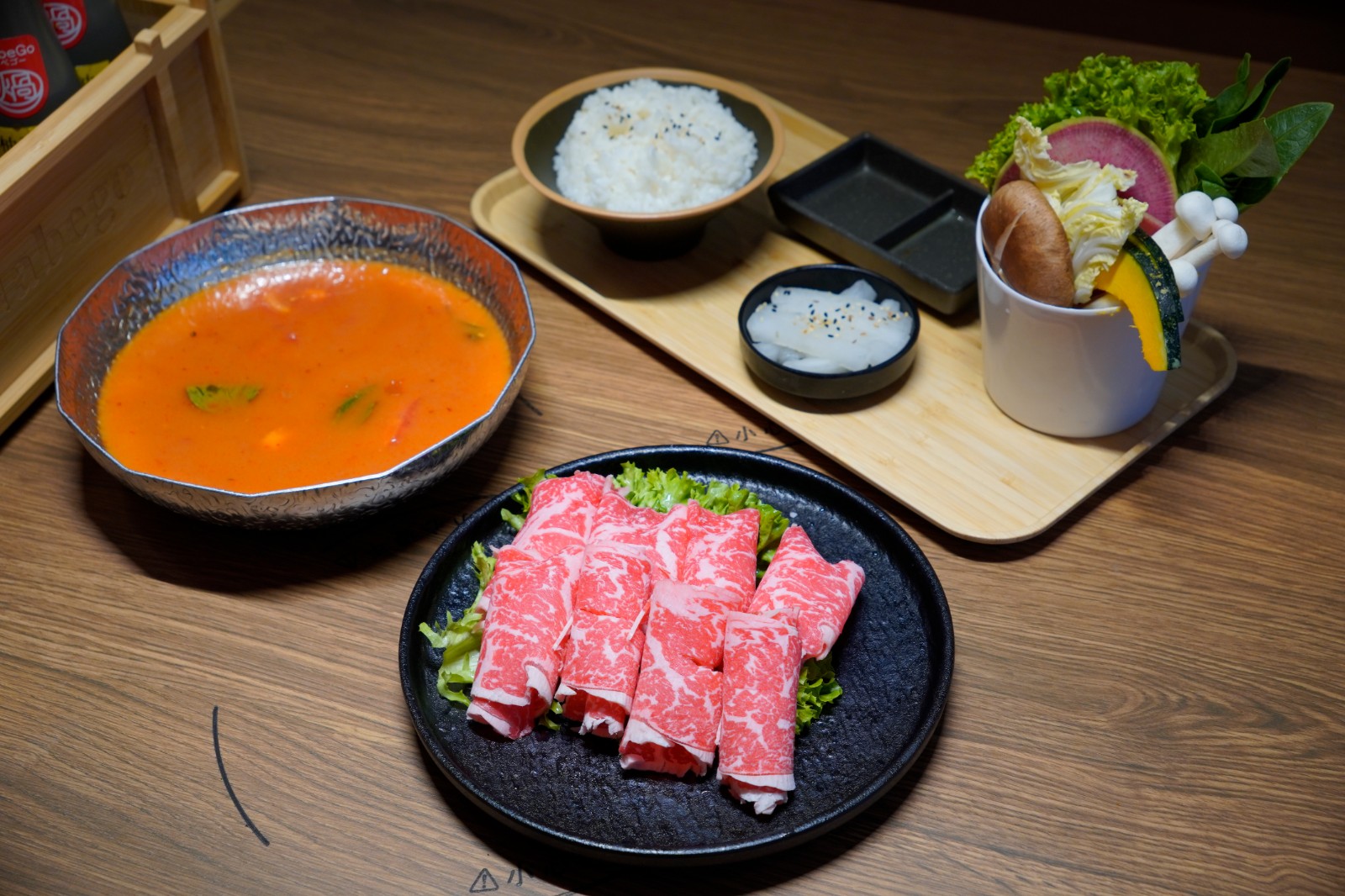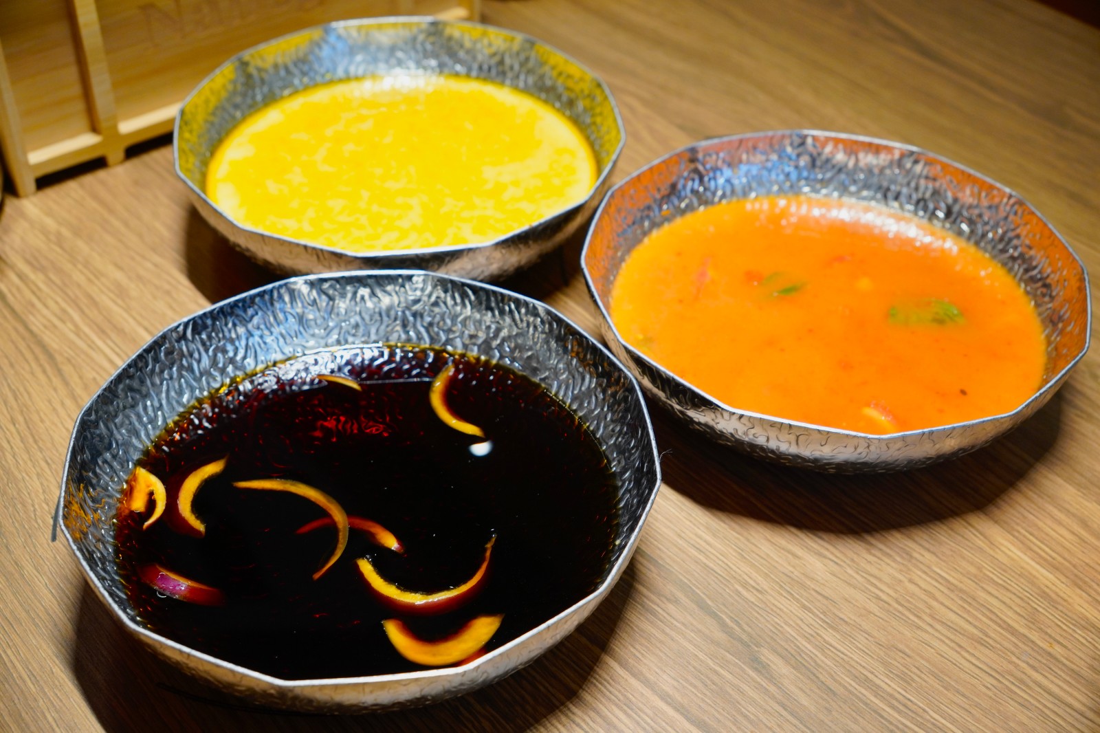 壽喜燒湯(左)、完熟蕃茄湯(右)及中華麻香藤椒湯(上)。
