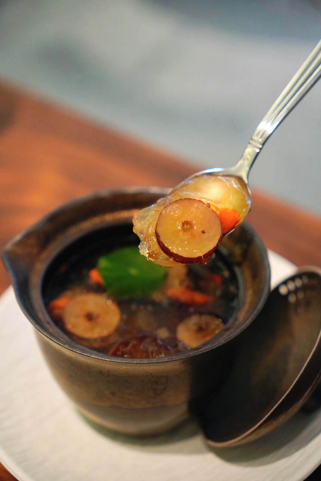 餐後食客可以寓意人生不同階段的茶飲作為一餐的結(jié)尾。茶飲由淡至濃分為4個(gè)茶系,包括人生起步的「嫩芽」、代表青春的「展開」、盛年拼搏期的「揚(yáng)眉」、呈現(xiàn)了晚年的「安逸」,味道分別主打幽雅花香、清爽果香、煙燻木香和回甘香厚,並有草本拼配茶、茶拿鐵、茶特調(diào)(無酒精雞尾酒)共3種沖泡方法?!刚归_」茶拿鐵採用向東烏龍,奶泡香滑,慢慢滲出茶香餘韻,香醇清香;「揚(yáng)眉」茶特調(diào)採用了薑花香單叢及正山小種紅茶,清爽中帶有茶味甘香。