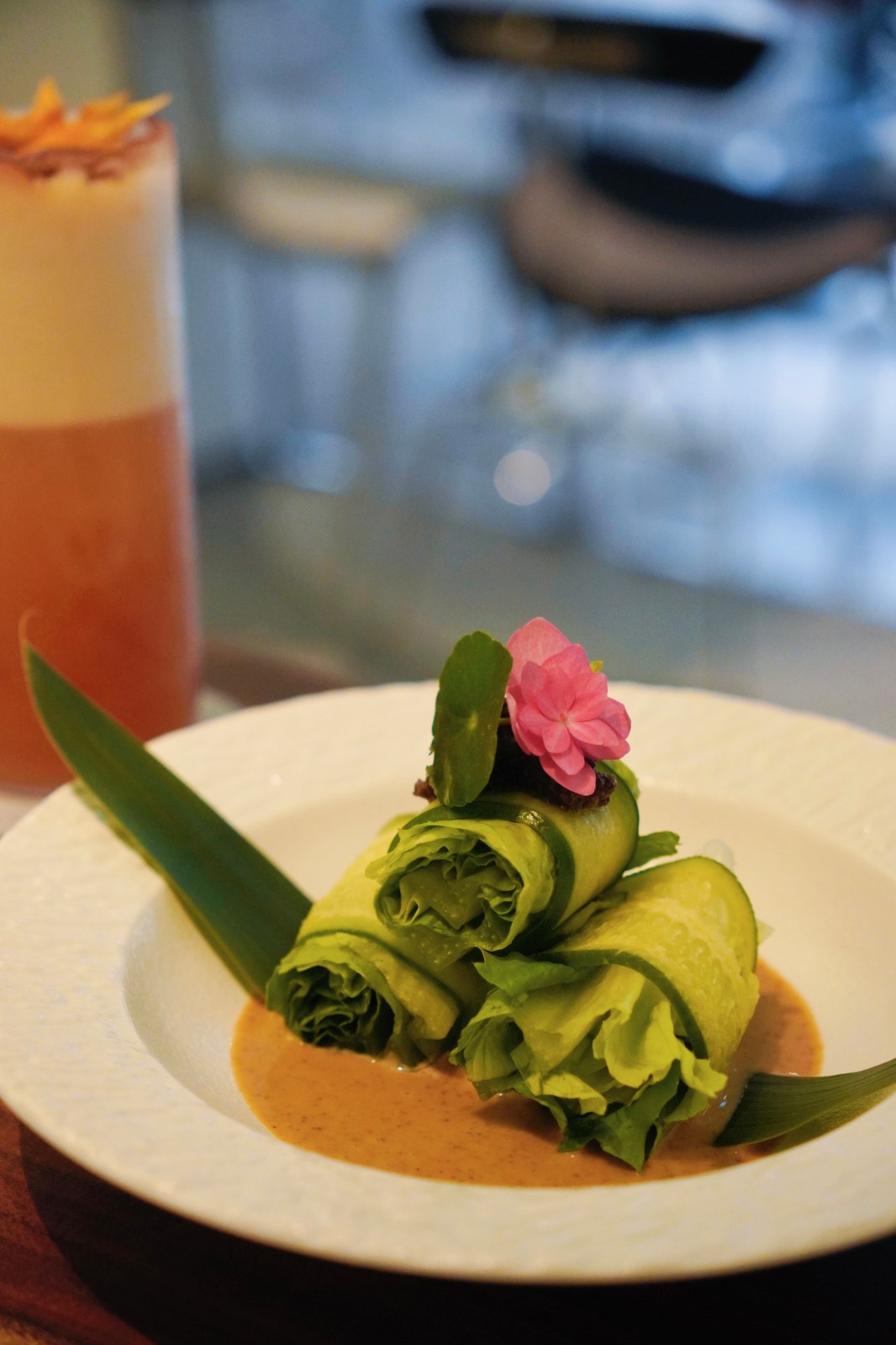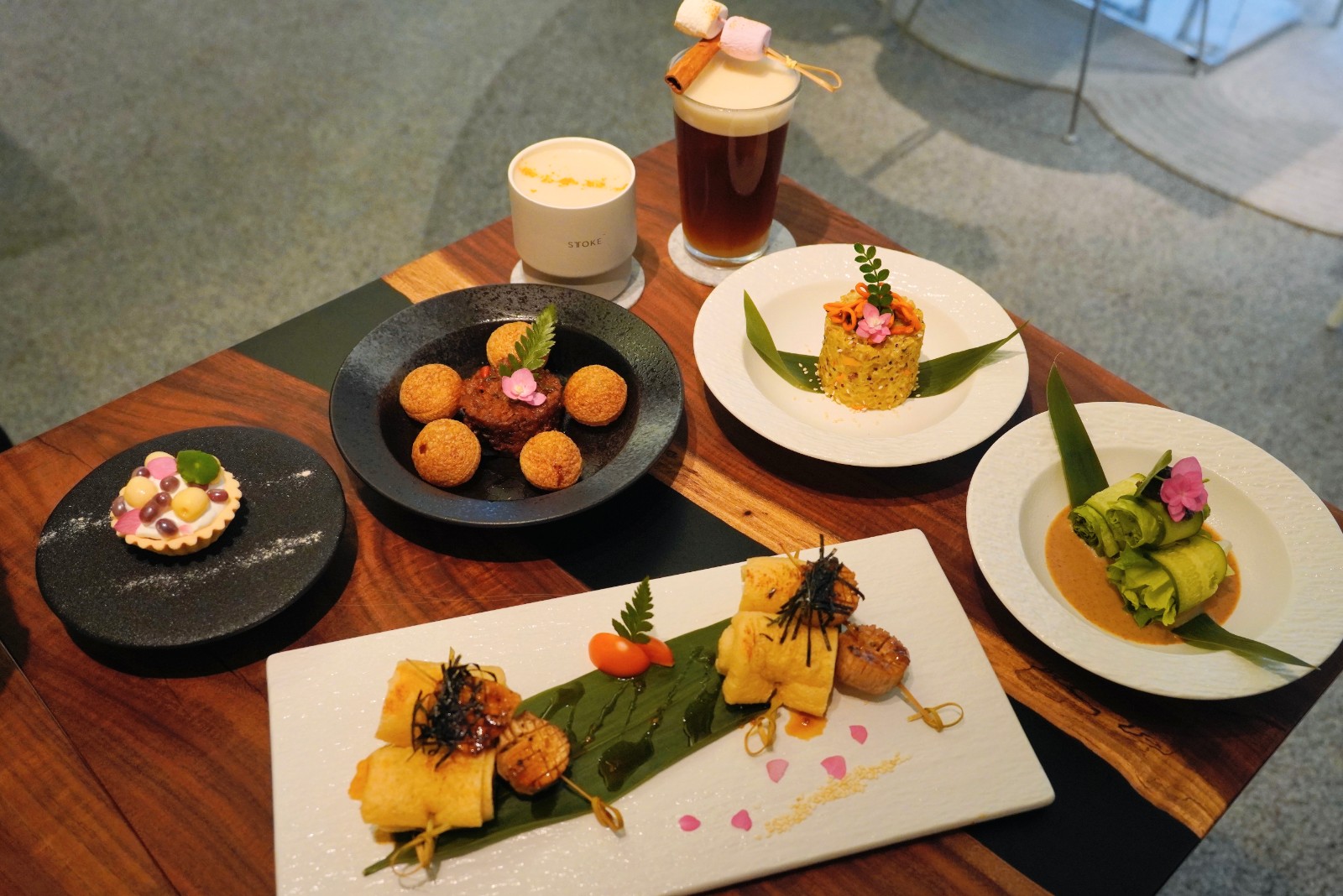 店舖環(huán)境簡約舒適,晚市套餐包括前菜、小食、主食、甜品。前菜有串燒櫻桃茄拼日式照燒素帶子及黑松露油麥菜卷,前者素帶子為燒至金黃色的杏鮑菇,鮮嫩多汁;後者口感清爽,濃郁的松露和麻醬增添層次感。小食泰式素肉配印度脆球,將香辣惹味的素肉填入空心油炸球內(nèi),一口吃掉多種口感味道交織,外脆內(nèi)香。主食黑松露蟲草花藜麥薏米飯熱量低,口感煙韌,恍如意大利飯,搭配黑松露與蟲草花,即使首次嘗試藜麥也不會覺得難以接受。紅豆波波蓮子撻是一道中西融合的甜品,大粒又飽滿的紅豆及清香的蓮子鋪在撻上,甜度適中。