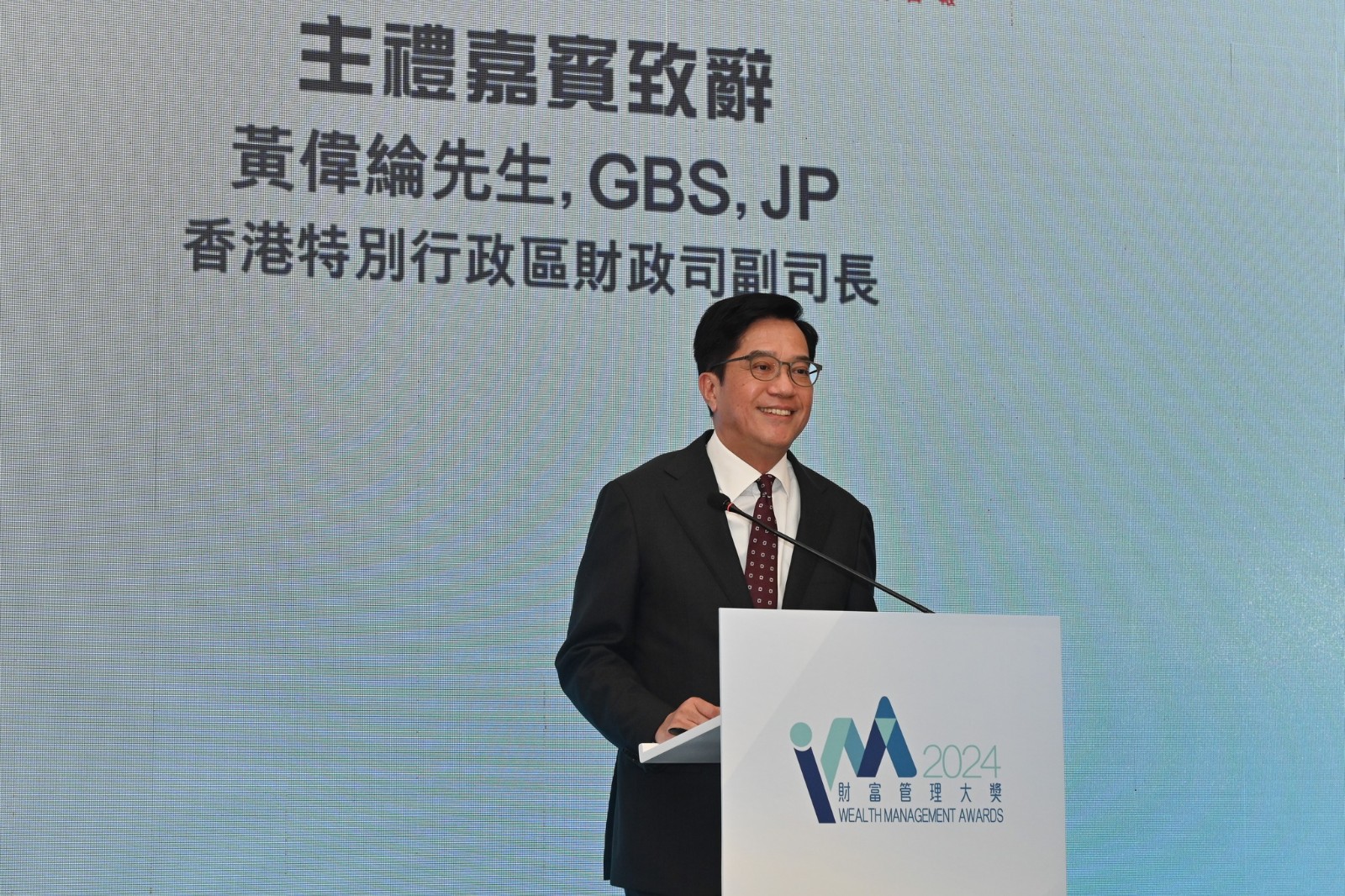 財(cái)政司副司長(zhǎng)黃偉綸今日(14日)出席「財(cái)富管理大獎(jiǎng)」2024頒獎(jiǎng)典禮並致辭,分享政府如何推動(dòng)資本市場(chǎng)和資產(chǎn)及財(cái)富管理。