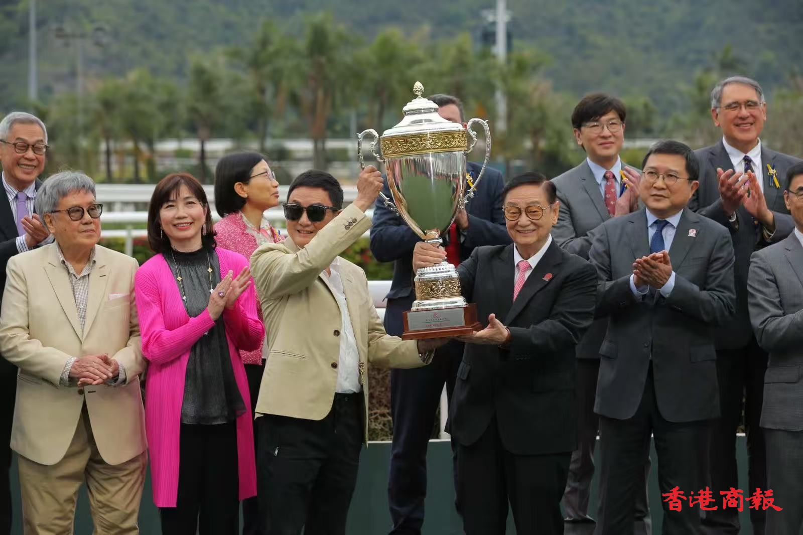 香港評馬同業(yè)協(xié)進會會長張基賽後將獎盃頒發(fā)獎盃予勝出頭馬「金主」馬主丁永章、丁同欣與丁同心,而主席吳伽樂則將小型獎盃頒發(fā)予練馬師文家良及騎師艾兆禮。(文/圖/片:志誠)