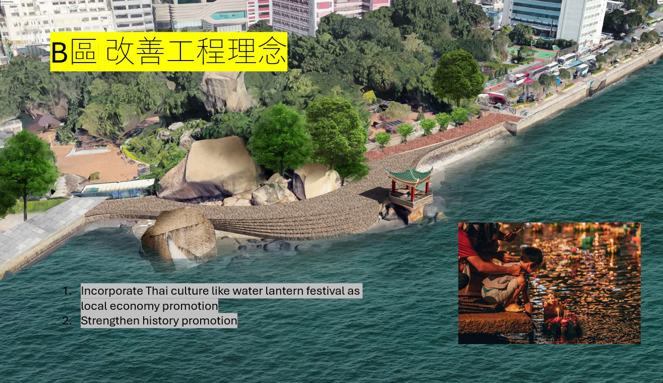 在馬坑涌/宋皇臺(tái)段(翔龍灣煤氣調(diào)壓站和碼頭設(shè)施)方面,建議海濱長(zhǎng)廊將牛棚藝術(shù)村的歷史與文化元素融入其中,增設(shè)歷史展覽區(qū)、藝術(shù)裝置或互動(dòng)式導(dǎo)覽,讓市民及遊客了解上址歷史演變。翔龍灣對(duì)開(臨海煤氣設(shè)施段)海濱研究增設(shè)行人路連接的可行性,將「九龍新海濱」與啟德體育園區(qū)結(jié)合,打造「體育+旅遊」經(jīng)濟(jì)模式,如舉辦海濱馬拉松、單車賽等,吸引體育愛好者及遊客。海濱範(fàn)圍還可增設(shè)單車徑與綠化區(qū)域,進(jìn)一步推廣政府「綠色出行」倡議及減低碳排放,以助香港在2050年前達(dá)致碳中和。該處更可引入智能健身器材如AI跑步機(jī)、互動(dòng)式單車等,讓市民在運(yùn)動(dòng)時(shí)享受科技帶來的樂趣;善用AI互動(dòng)藝術(shù)裝置,將運(yùn)動(dòng)與光影及聲音互相結(jié)合,讓市民在互動(dòng)中放鬆身心。