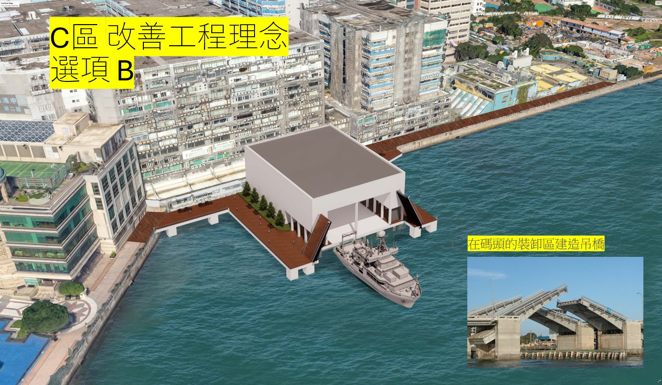 團(tuán)隊(duì)在黃埔/土瓜灣段(青洲英泥碼頭)均有兩個(gè)建議,第一是假設(shè)成功取得九龍永久碼頭90號(hào)的擁有權(quán),與相關(guān)業(yè)權(quán)持份者共同構(gòu)建多功能海濱活動(dòng)空間,周末舉行跳蚤市場(chǎng)、文藝表演等不同主題活動(dòng);閒時(shí)成為公共休憩空間,如藝文空間、垂釣區(qū)域等,讓區(qū)內(nèi)居民使用。其次為未有取回九龍永久碼頭90號(hào)的擁有權(quán),透過增設(shè)海濱棧道、開合橋等改善海港工程項(xiàng)目,令黃埔及土瓜灣海濱能成功連接。