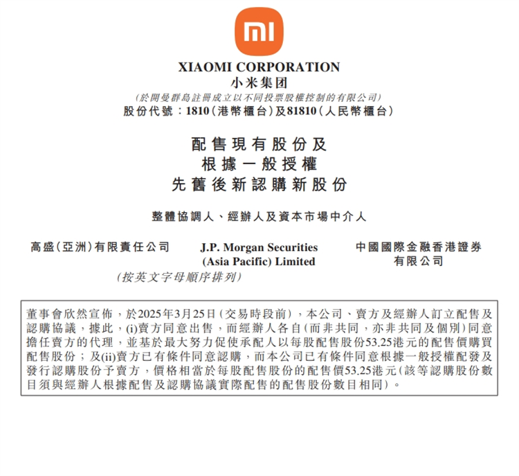 3月25日,小米集團在港交所公告,擬配售8億股現(xiàn)有股份,配售價為每股53.25港元,本次認購預計籌資淨額約425億港元,將用於業(yè)務擴張、研發(fā)投資及其他一般用途。