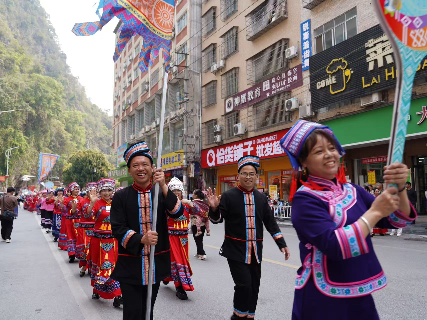 活動(dòng)當(dāng)天,伴隨著嘹亮的山歌和歡快的銅鼓聲,由各鄉(xiāng)鎮(zhèn)組成的方陣依次登場,展現(xiàn)絢麗多彩的民族風(fēng)情。隨後,各方陣緩緩地走向東蘭縣文化中心廣場開展山歌、非遺、銅鼓、美食等特色巡遊,吸引了眾多的群眾前來觀看。