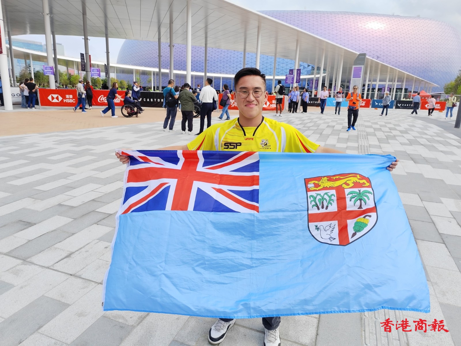 雷先生手持斐濟(jì)國(guó)旗進(jìn)場(chǎng),以10分為滿分,給予啟德場(chǎng)館8分。記者 馮瀚文攝