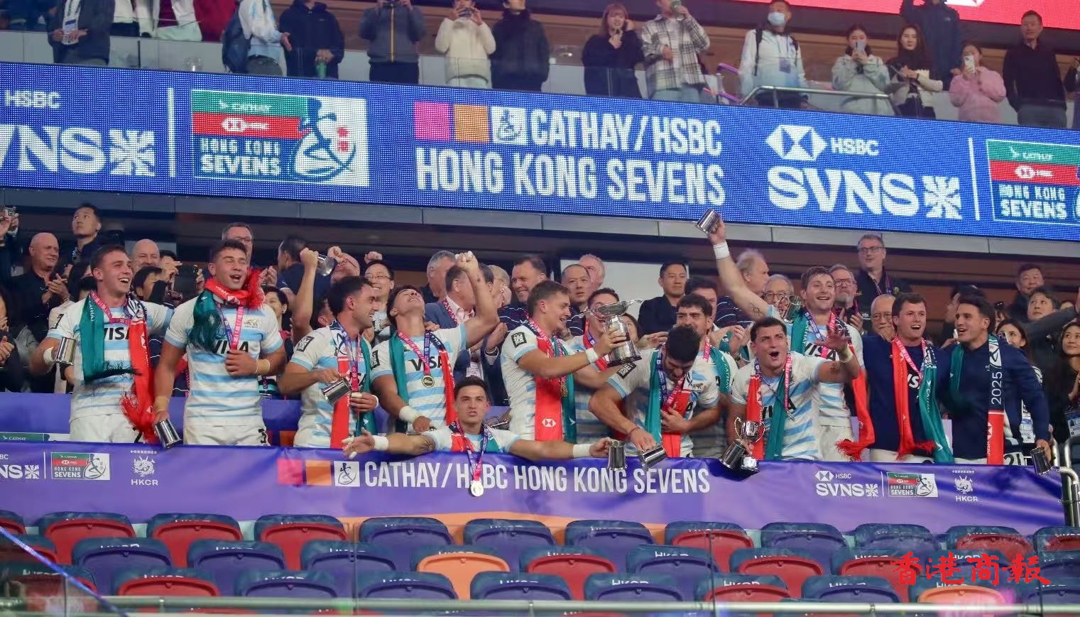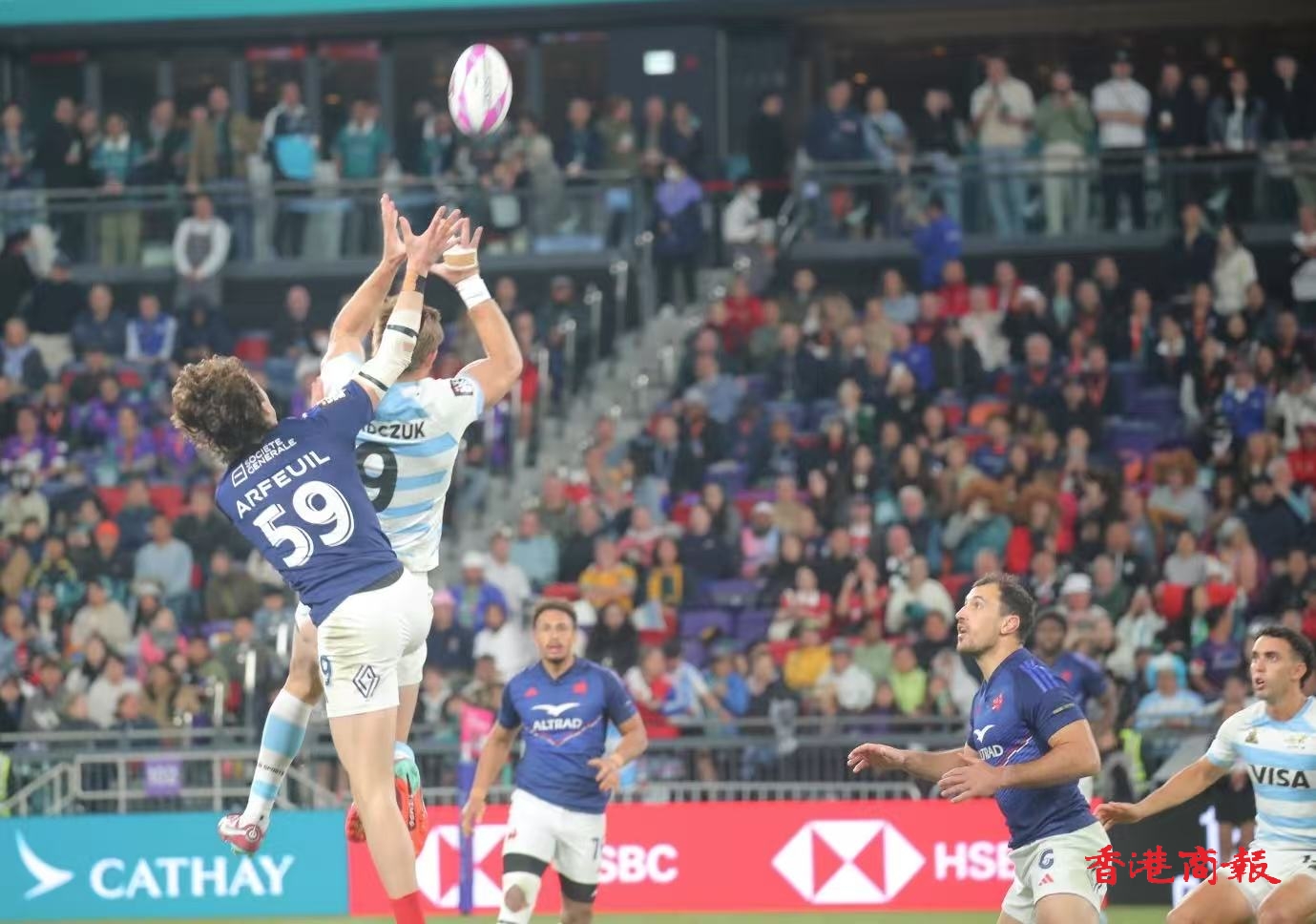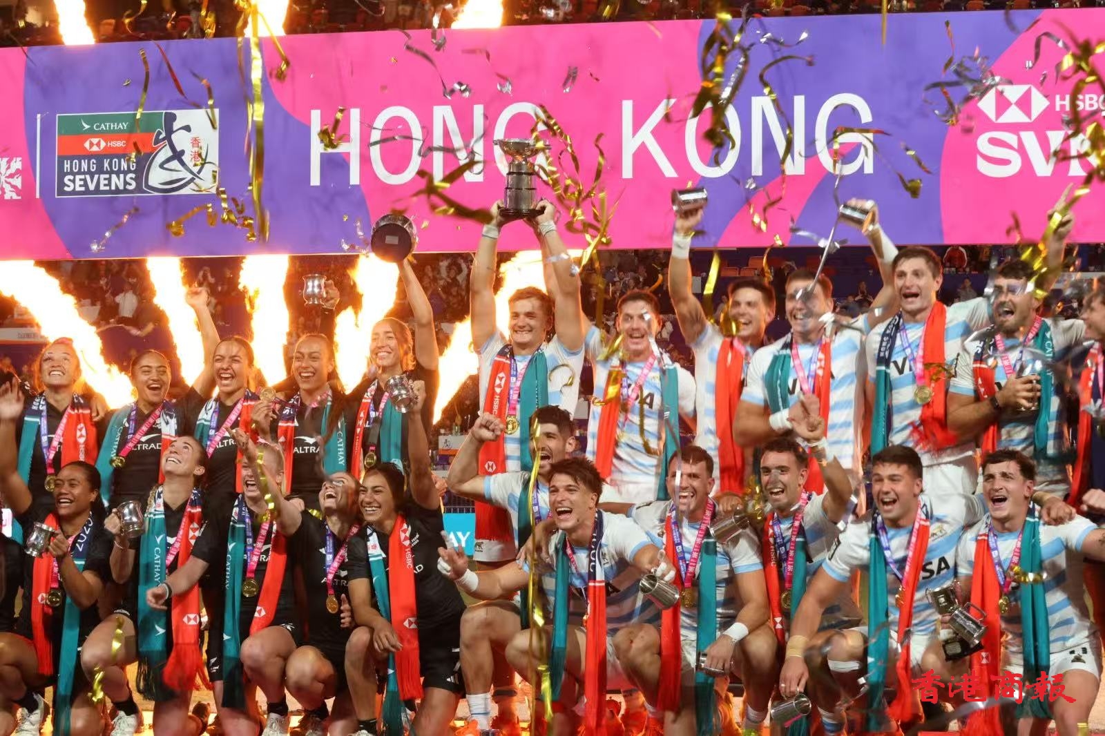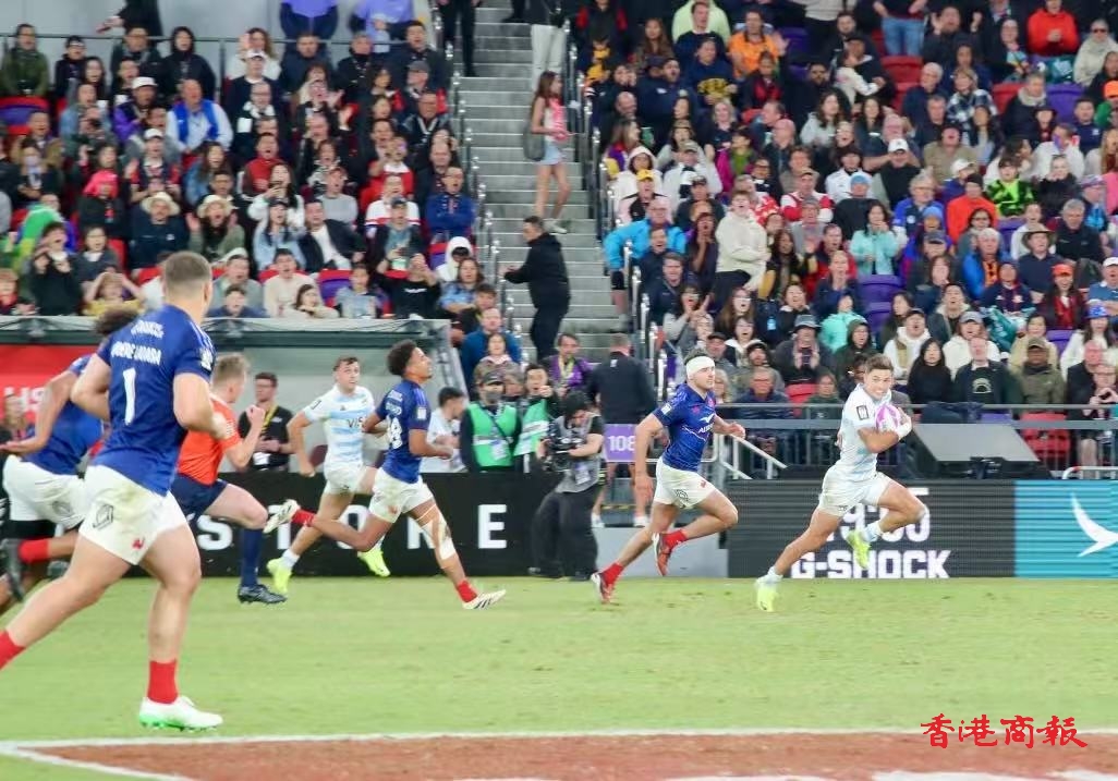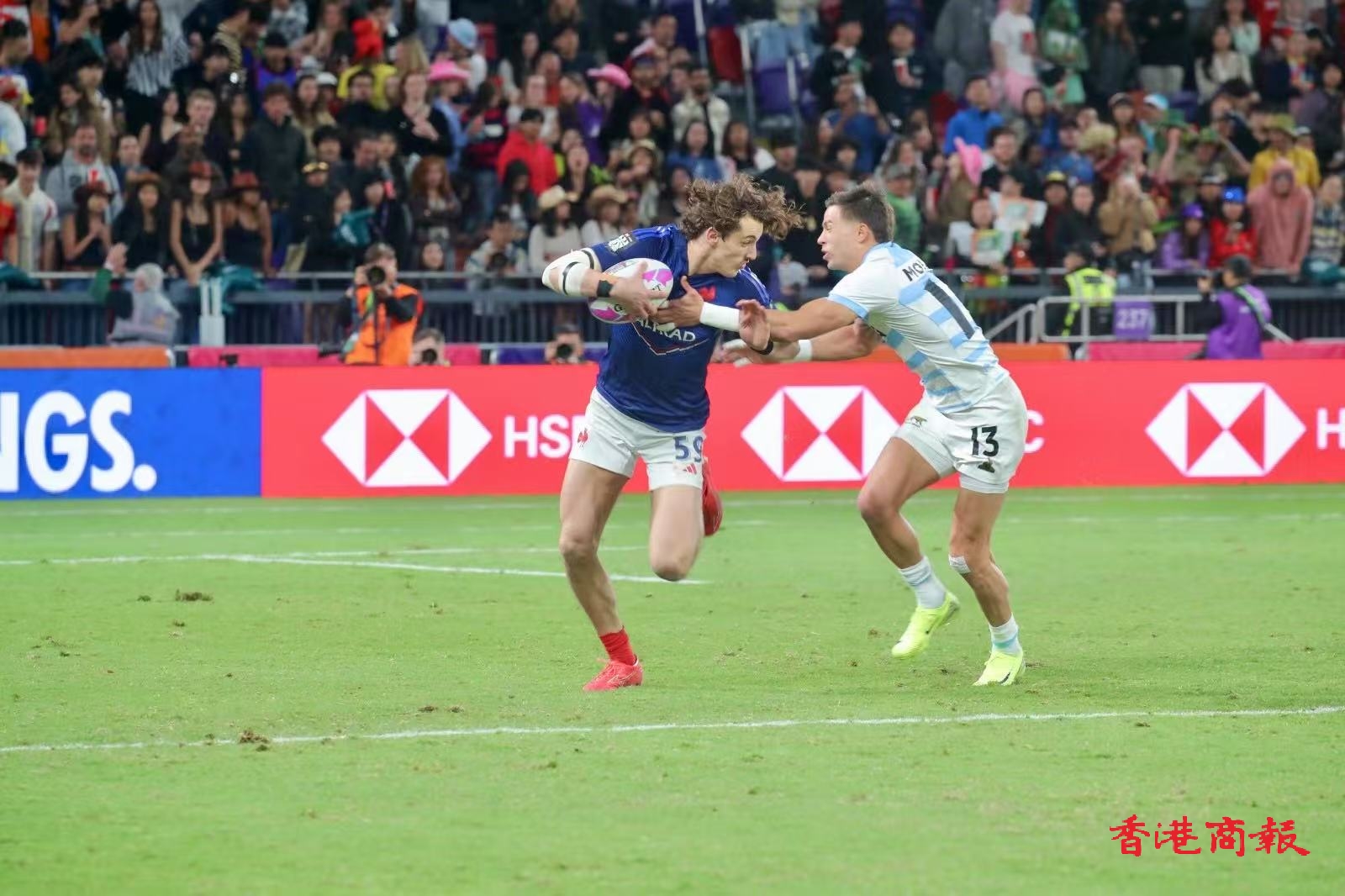 啟德主場館舉行「國泰/滙豐香港國際七人欖球賽」(香港七欖)今日(30日)上演最後一日賽事,全日入場人數(shù)達(dá)到38352,場面非常熱鬧。晚上進(jìn)行的壓軸戲男子組決賽,由系列賽排榜首的阿根廷出戰(zhàn)法國,兩軍上半場互無紀(jì)錄,進(jìn)入下半場,法國有迪拉馬粗野欄截領(lǐng)黃牌須離場2分鐘,阿根廷把握多打一人的優(yōu)勢,憑著艾華利斯、蒙尼達(dá)達(dá)陣得分,取得12比0優(yōu)勢,法國完場前由阿費爾破蛋,最終阿根廷贏12比7完場,在香港站奪標(biāo)。行政長官李家超賽後出席頒獎儀式。(文、圖、片:志誠)
