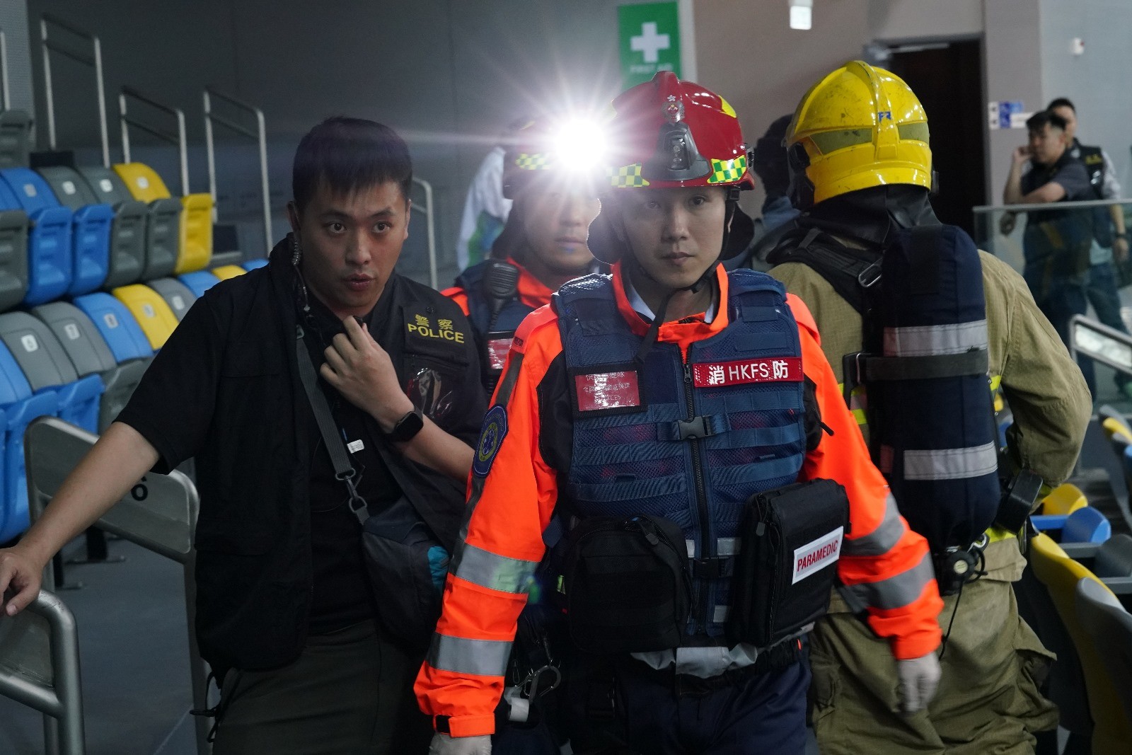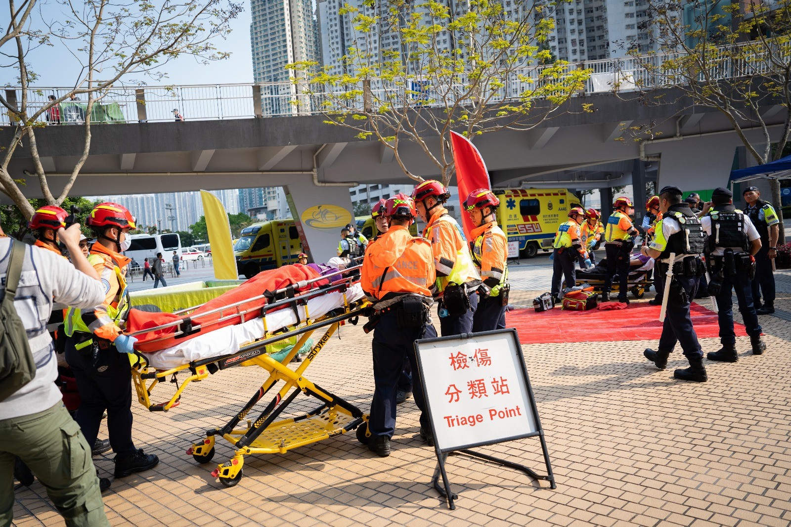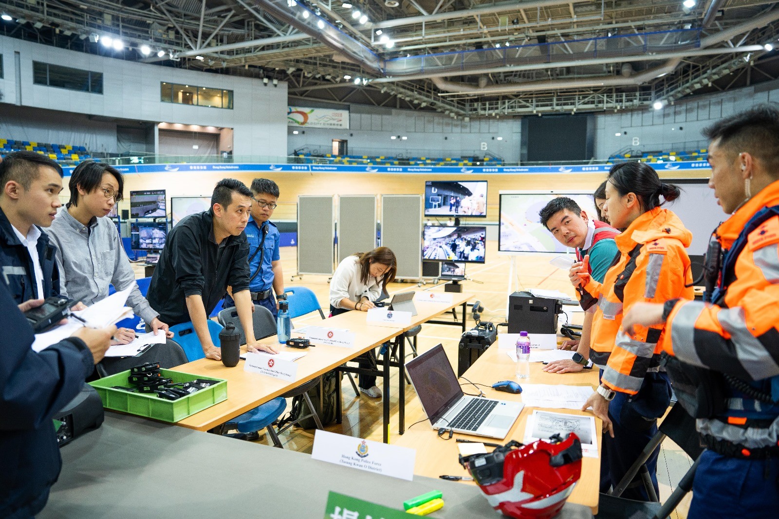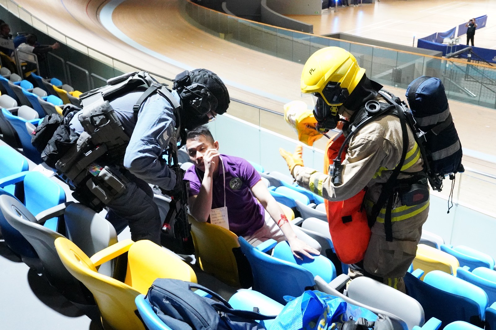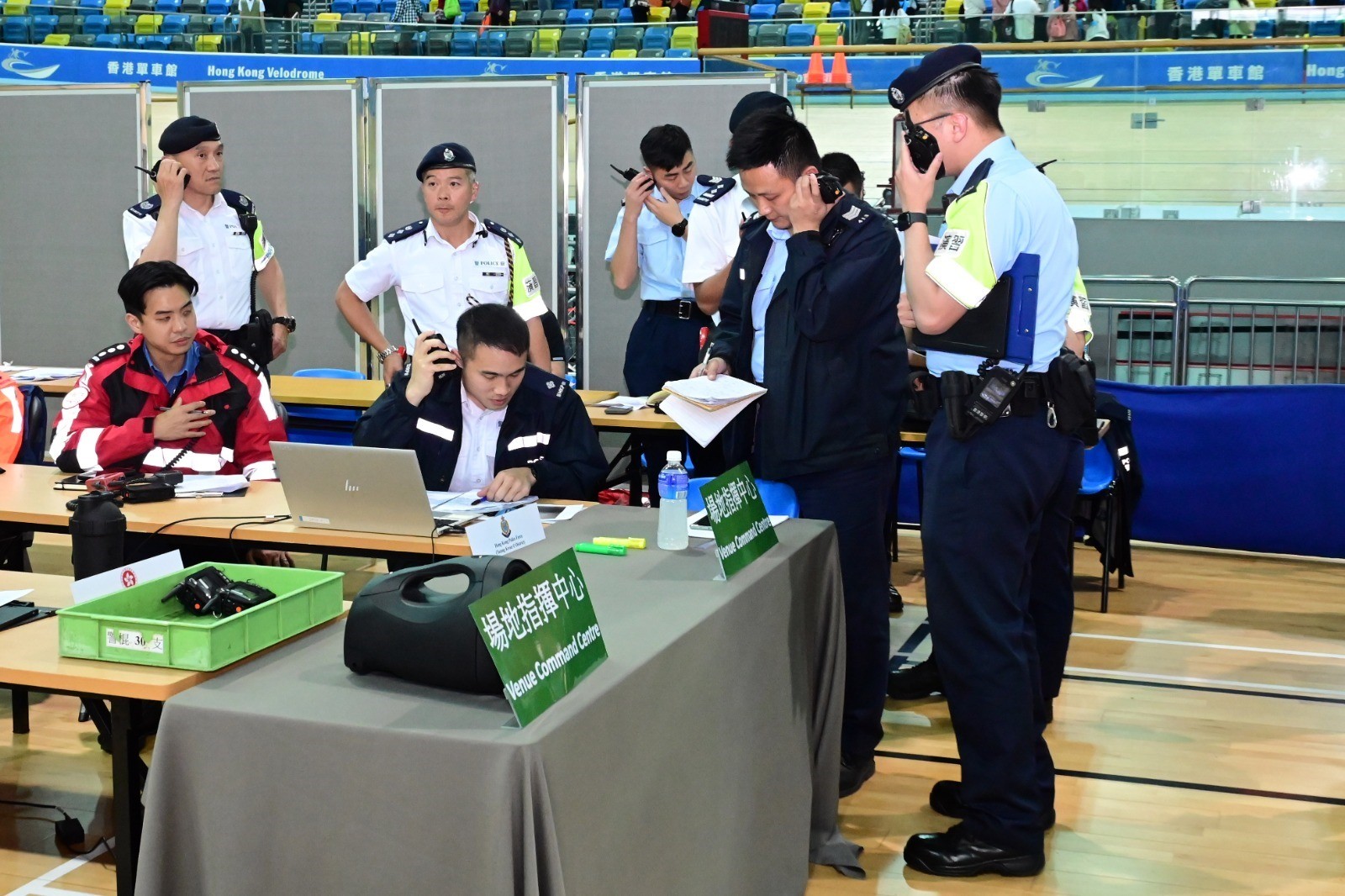 4月7日下午,警務(wù)處東九龍總區(qū)行動(dòng)部和機(jī)動(dòng)部隊(duì)總部聯(lián)同文化體育及旅遊局、醫(yī)院管理局、消防處、民政事務(wù)處、義務(wù)工作發(fā)展局、康樂及文化事務(wù)署及民安隊(duì),於香港單車館舉行代號(hào)「勇衛(wèi)」的跨部門重大事故暨人群管理演習(xí),以加強(qiáng)警方與不同部門在全運(yùn)會(huì)期間處理重大事故的溝通、協(xié)作和應(yīng)變能力。