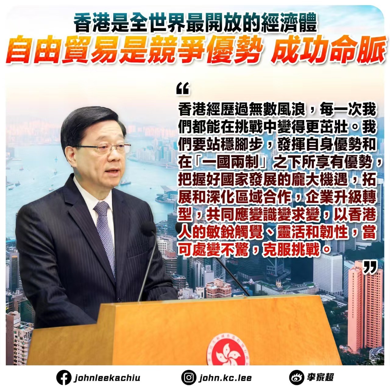 李家超強(qiáng)調(diào),特區(qū)政府會(huì)繼續(xù)保持香港自由港地位,奉行自由貿(mào)易政策,保障貨物、資金和資訊等的自由流動(dòng),吸引世界各地來(lái)港進(jìn)行貿(mào)易和投資,享受香港機(jī)遇、中國(guó)機(jī)遇。只要站穩(wěn)腳步,發(fā)揮自身和「一國(guó)兩制」優(yōu)勢(shì)等,加上香港人的敏銳觸覺(jué),當(dāng)可處變不驚,克服挑戰(zhàn)。