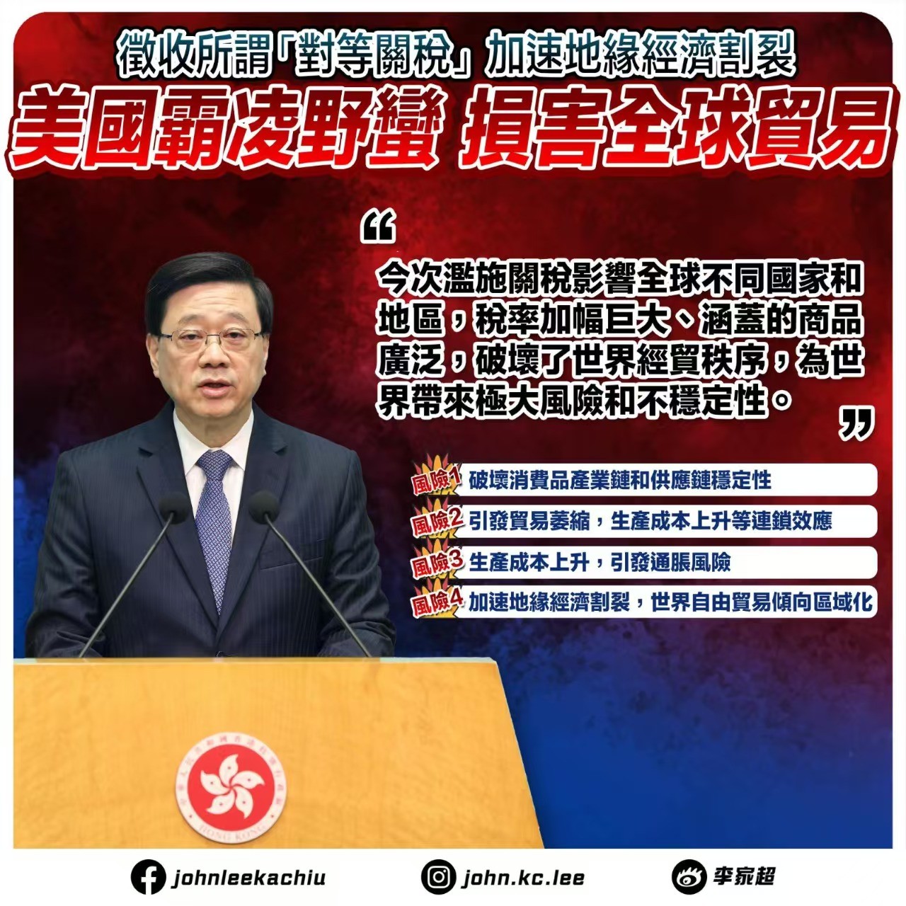 行政長(zhǎng)官李家超今日(8日)出席行會(huì)前見(jiàn)傳媒表示,上星期美國(guó)宣布對(duì)多個(gè)貿(mào)易夥伴徵收所謂「對(duì)等關(guān)稅」,其中向香港產(chǎn)品加徵三成四關(guān)稅,連同早前宣布的兩成關(guān)稅,累計(jì)徵收五成四關(guān)稅。他批評(píng)美國(guó)不再奉行自由貿(mào)易,破壞國(guó)際共同建立的世界貿(mào)易規(guī)則,做法霸凌野蠻。他說(shuō),美國(guó)的做法損害全球貿(mào)易,嚴(yán)重破壞多邊貿(mào)易體制及全球化進(jìn)程,為世界帶來(lái)極大風(fēng)險(xiǎn)。