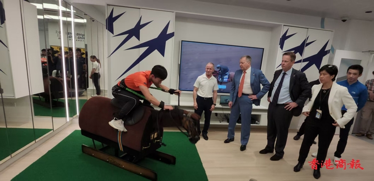 應(yīng)家柏及後在夏定安、馬會見習(xí)騎師學(xué)校首席騎術(shù)教練高雅志陪同下參觀裝修好的馬房,他們又走進(jìn)課室,觀看見習(xí)學(xué)員踏上馬匹訓(xùn)練工具示範(fàn)。應(yīng)家柏鼓勵見習(xí)學(xué)員,努力向夢想進(jìn)發(fā)。