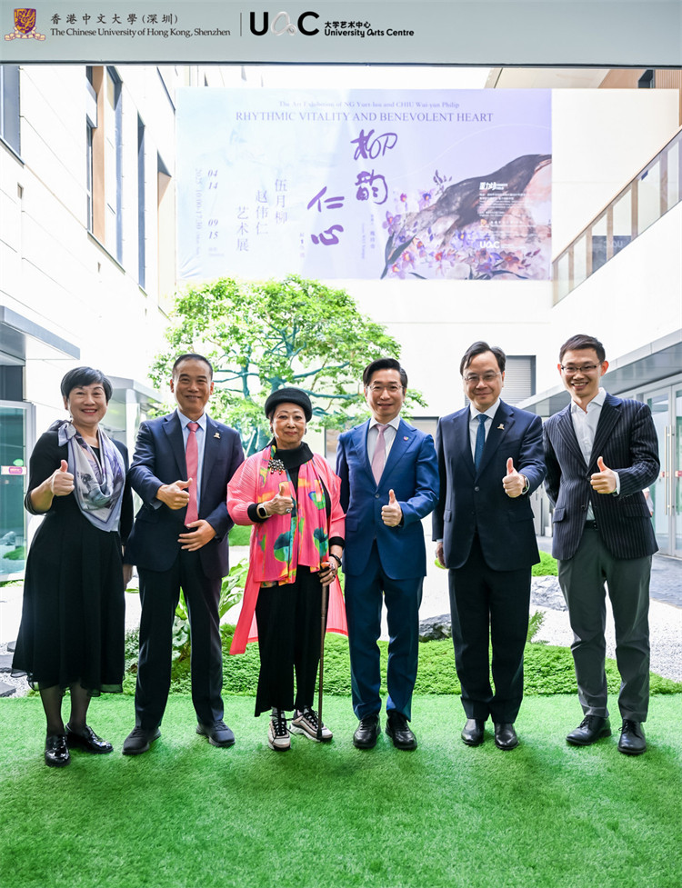當(dāng)天,香港中文大學(xué)(深圳)理事會主席、香港中文大學(xué)校長盧煜明教授,香港中文大學(xué)(深圳)校長徐揚(yáng)生教授等嘉賓蒞臨展覽現(xiàn)場,在策展人魏祥奇先生及藝術(shù)家伍月柳教授、趙偉仁教授的陪同下觀摩展覽。