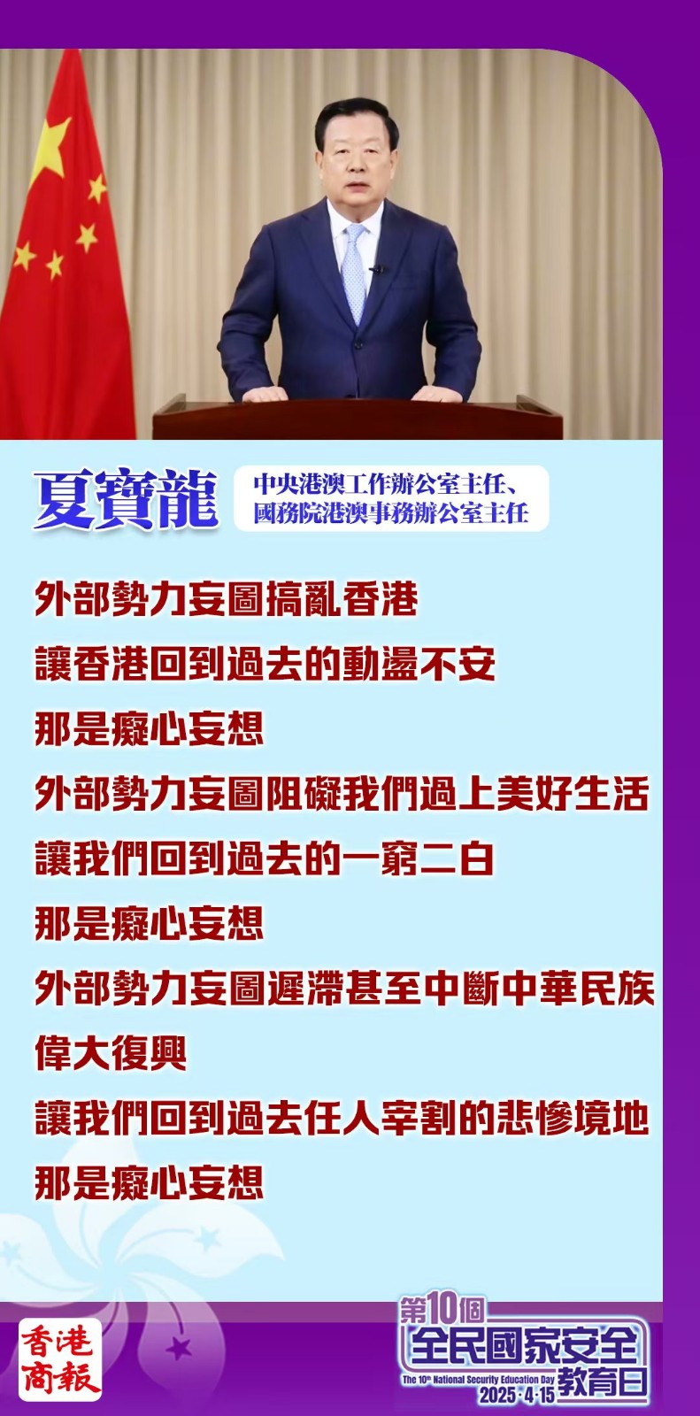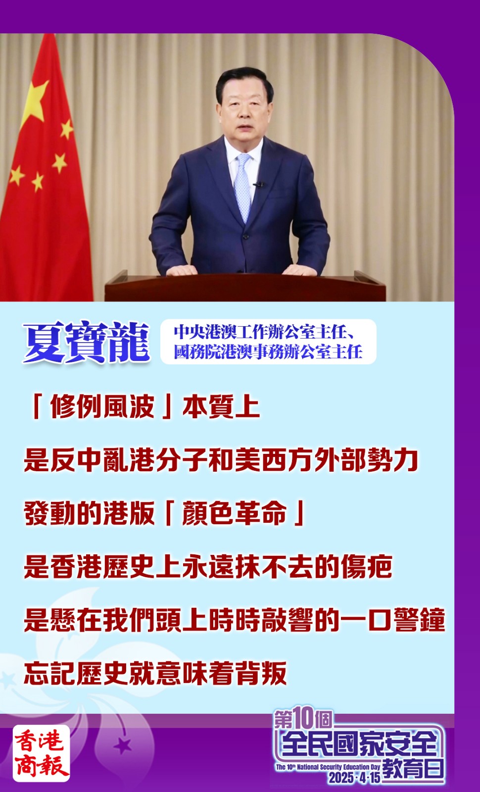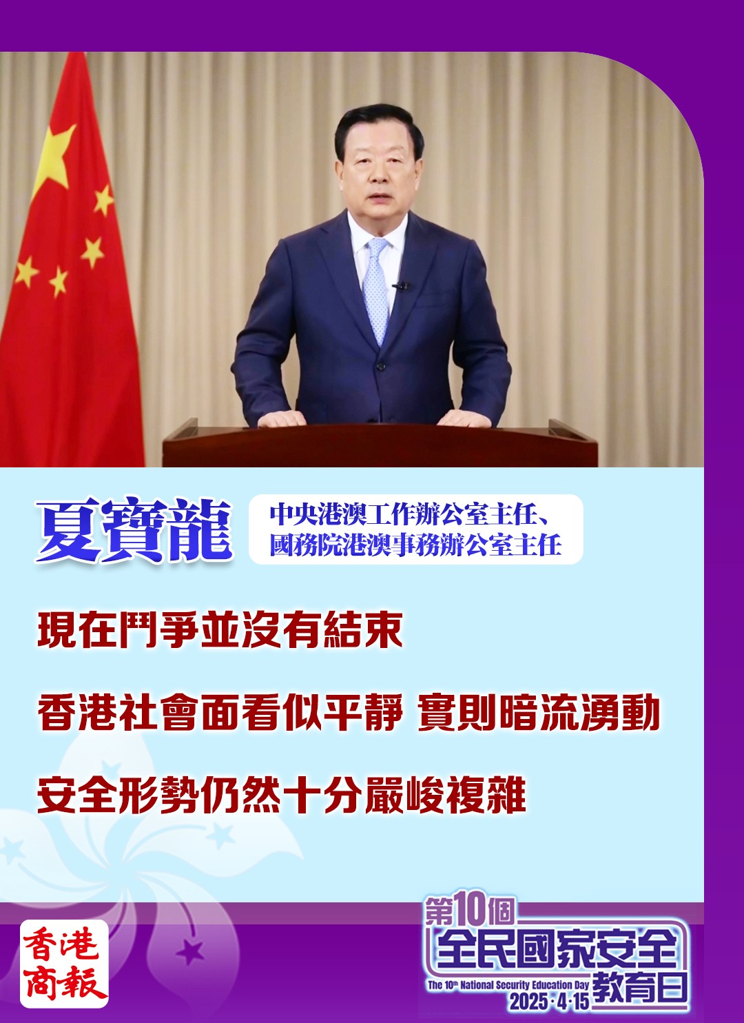 全民國家安全教育日開幕典禮暨主題講座今日(15日)在會展中心舉行,中央港澳工作辦公室主任、國務(wù)院港澳事務(wù)辦公室主任夏寶龍以視頻方式出席開幕禮,並發(fā)表主旨講話。以下為夏寶龍主任講話金句: