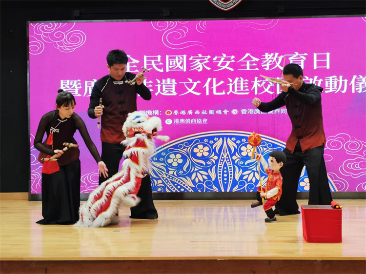 頂圖圖說(shuō):全民國(guó)家安全教育日暨「廣西非物質(zhì)文化遺產(chǎn)」進(jìn)校園活動(dòng)啟動(dòng)儀式,今早在觀塘樂(lè)善堂楊仲明學(xué)校舉行。(記者 馮瀚文攝)