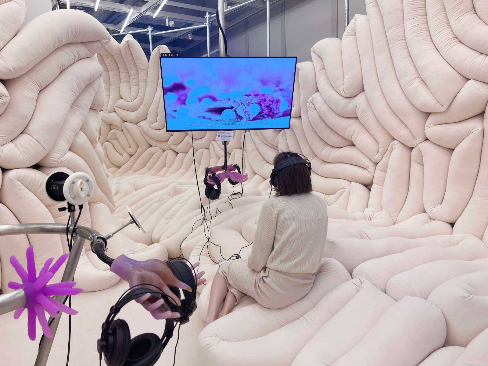 在柔軟靠枕組成的互動裝置內(nèi)可同時探索13件不同形式ASMR的視聽作品,涵蓋催眠、耳語、近距觀看精細工作等場景。
