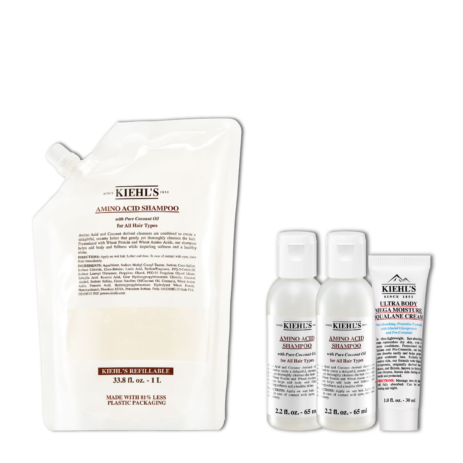 氨基酸洗髮水 (補(bǔ)充裝) 套裝,HK$650 (價(jià)值HK$808)。包括氨基酸洗髮水補(bǔ)充裝1L,2支氨基酸洗髮水65ml,特效超保濕身體乳霜30ml。